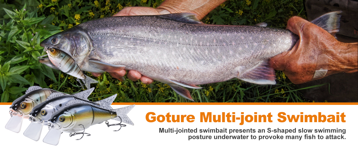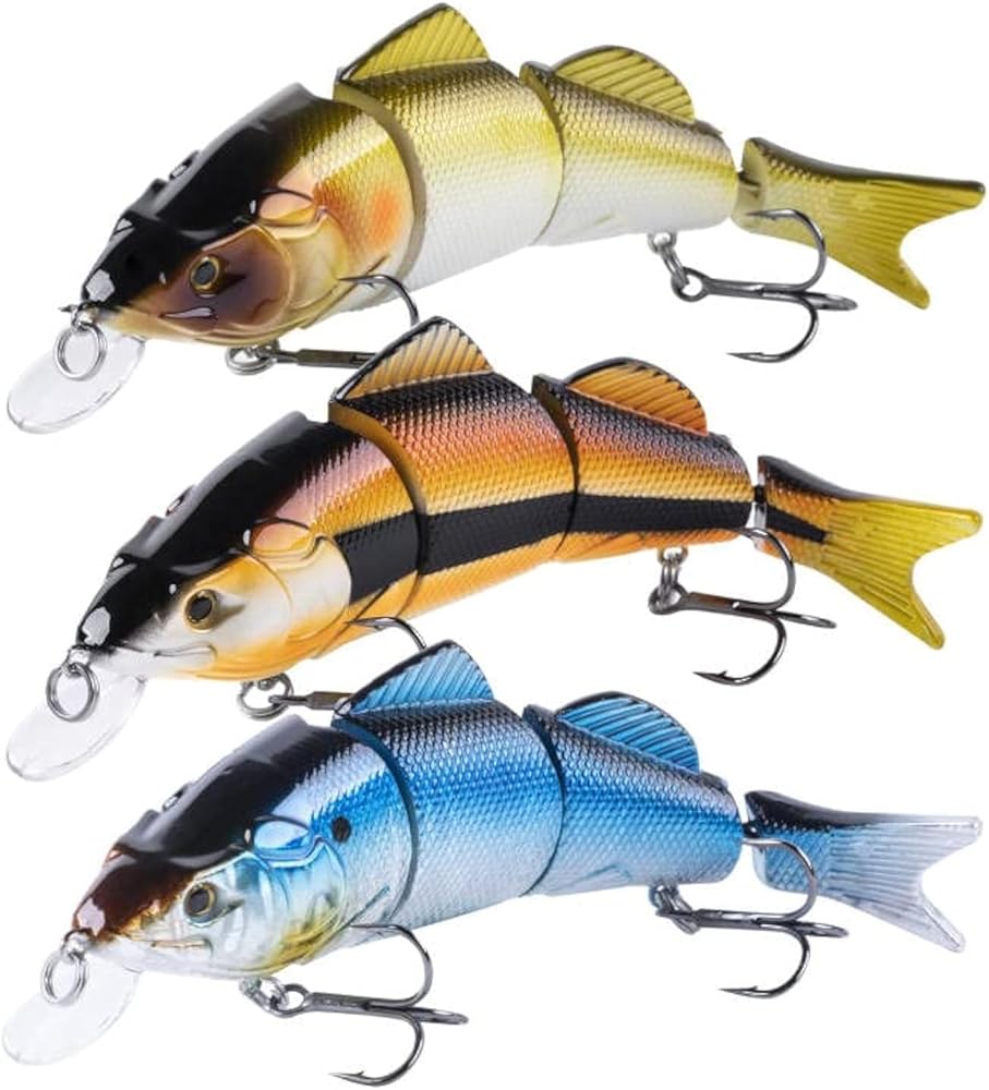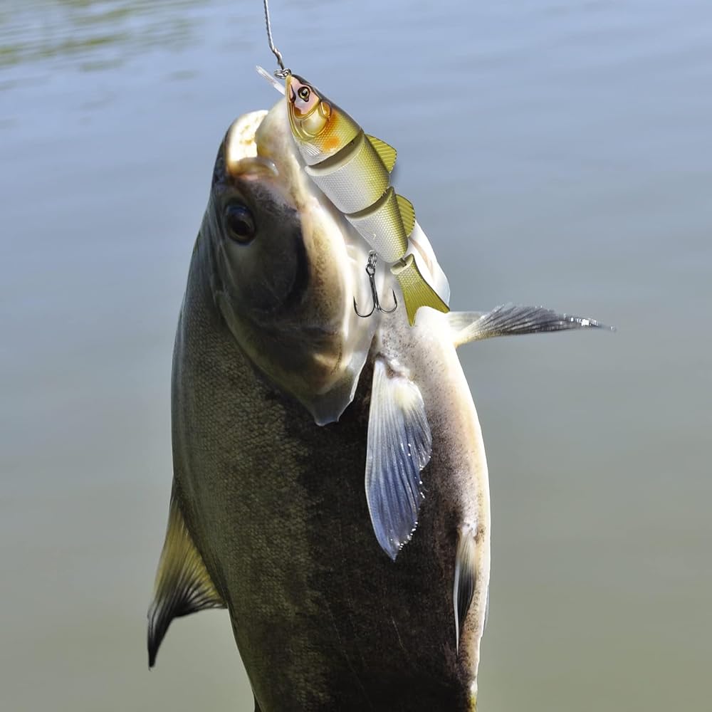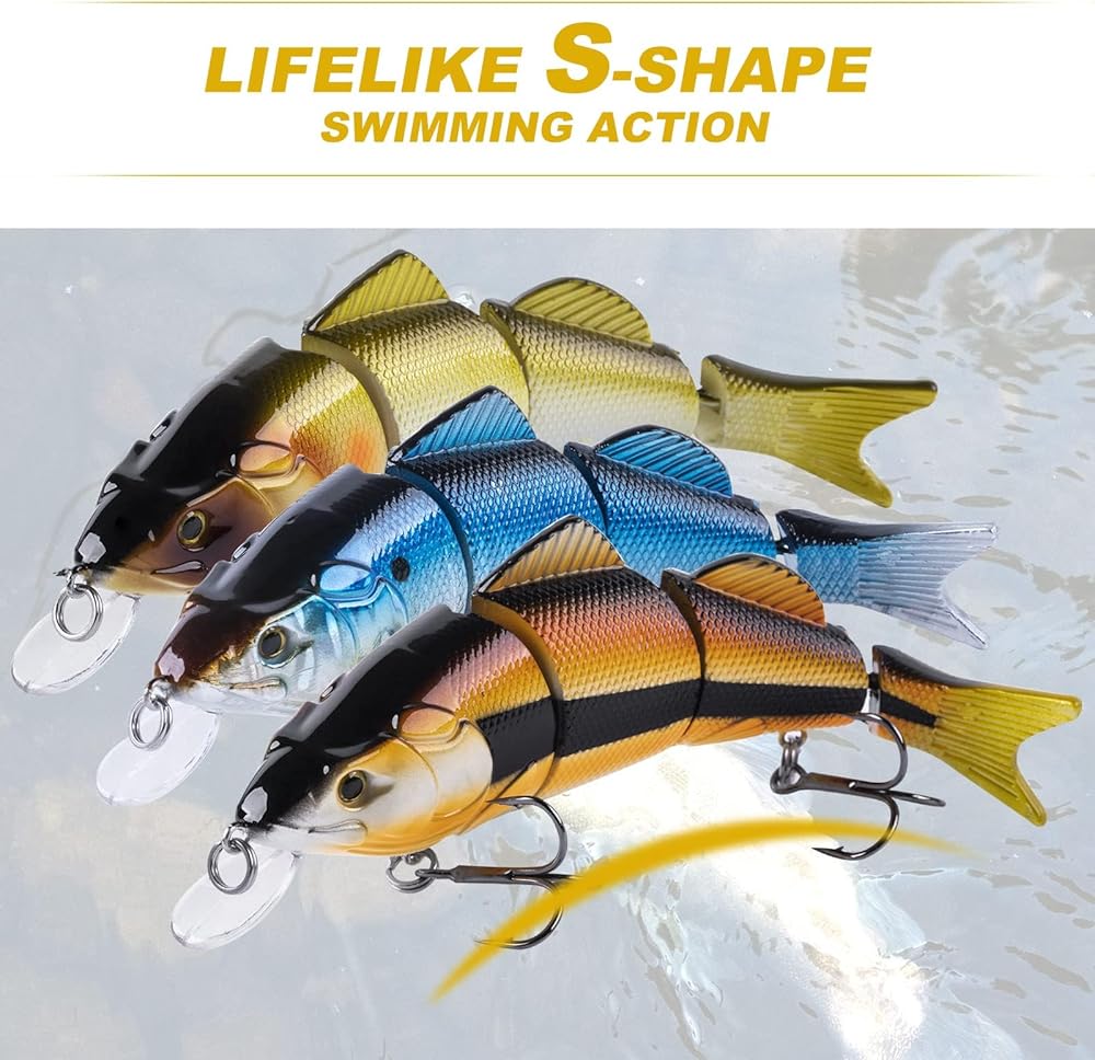 Swimbait متعددة المفصلات: تتصل أقسام الجسم المختلفة بمساعدة المعدن ، مما يضمن أن إغراء الصيد يمكن أن يقاوم لدغة قوية من الأسماك الكبيرة مع كسر أو تلف. الخطاف الثلاثي الحاد يسمح باختراق أفضل