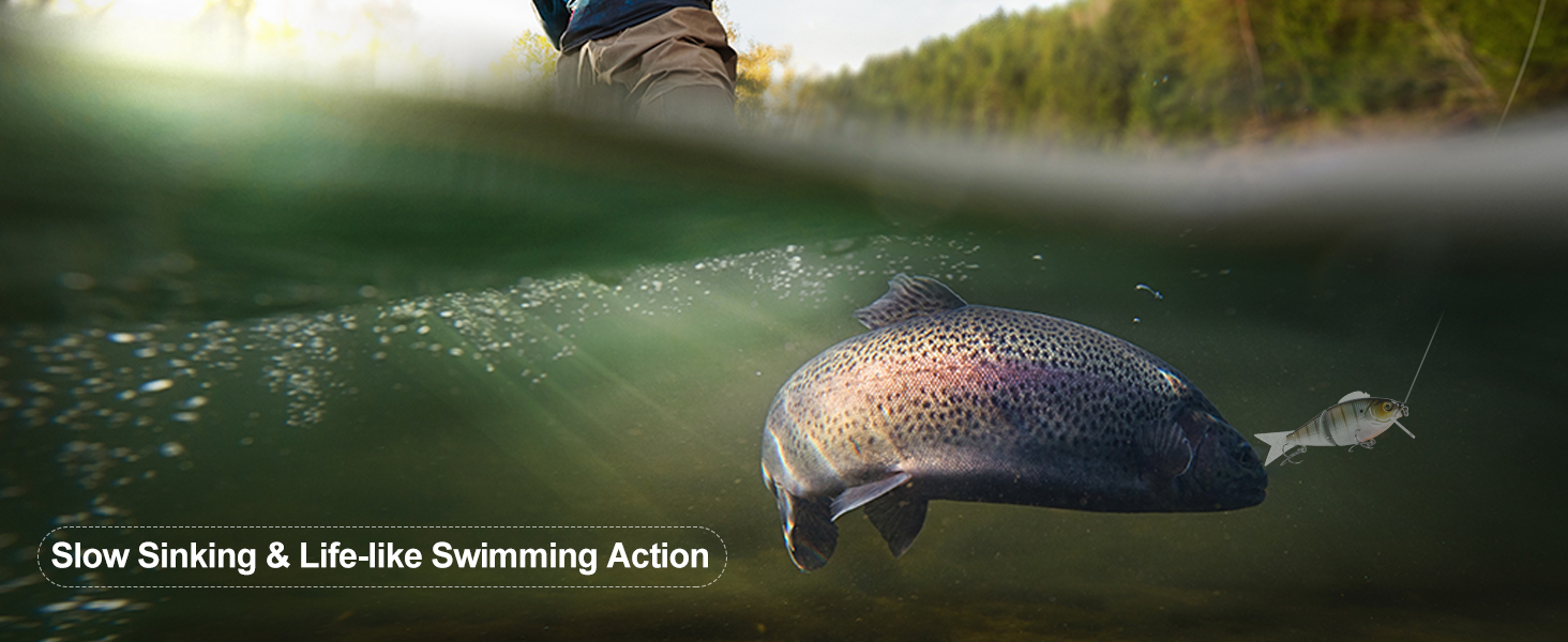 حركة السباحة الزاهية: تم تصميم طعوم السباحة الخاصة بنا لصيد الأسماك الجهير بأجسام مجزأة تسمح لها بالمرونة أثناء السباحة. تقدم هذه السباحة وضعية بطيئة على شكل S تحت الماء لإثارة العديد من الأسماك للهجوم