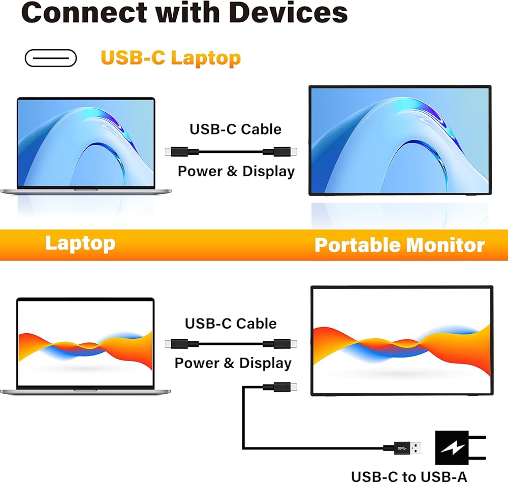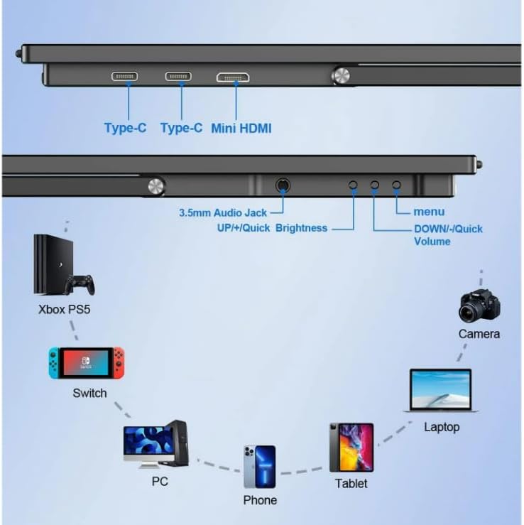 منافذ متعددة لسهولة الاتصال --- يتم تجهيز الشاشة المحمولة 18.5 بوصة بمنفذ HDMI صغير ومنفذ نوعان من النوع C. إنه متوافق مع PS 3/4 ، Xbox ، الكمبيوتر المحمول ، الكمبيوتر ، الهاتف ، Wii ، التبديل ، لوحة المفاتيح والماوس.