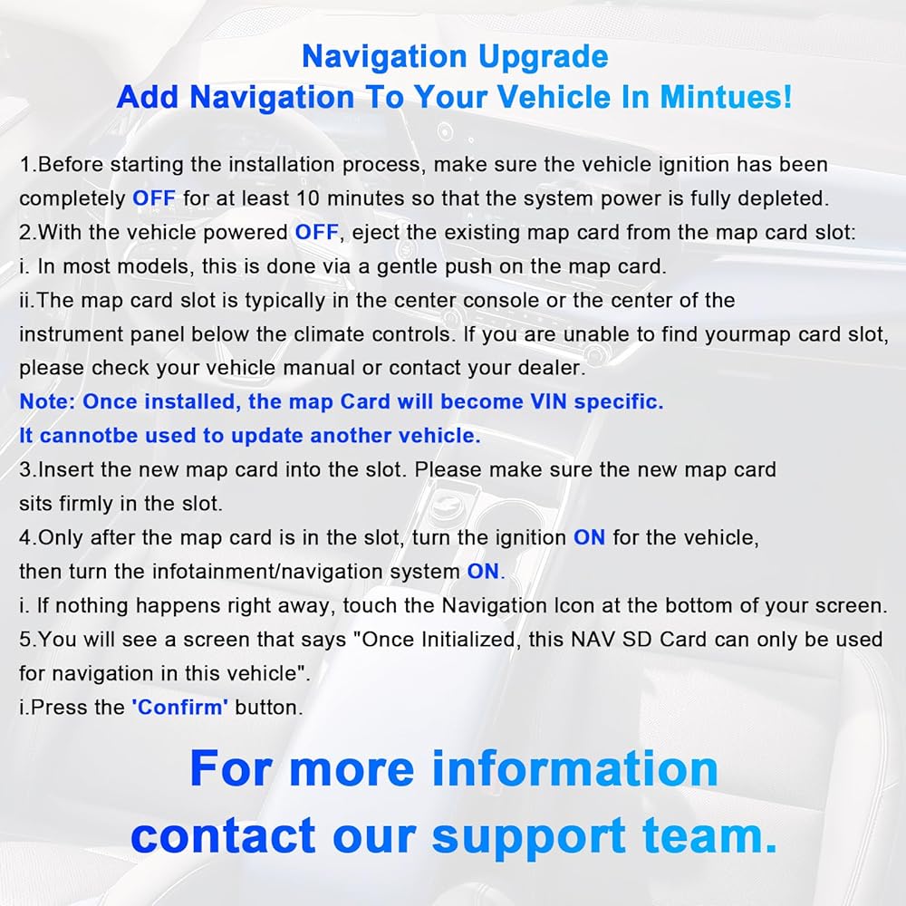 [خطوات التثبيت] قم أولاً بإيقاف تشغيل سيارتك واحتفظ بالمحرك قبل إزالة بطاقة SD Micro Micro SD وإدخال بطاقة SD جديدة. بعد إدخال بطاقة التنقل SD في الفتحة ، قم بتشغيل المحرك وسيتم تحديث النظام. انتظر حتى تنتهي عملية التحديث ، يرجى التأكد من عدم إيقاف تشغيل المحرك أثناء العملية ، يمكنك الاستمتاع بالتنقل الدقيق لبطاقة SD. ملاحظة: تأكد من أن سيارتك تستخدم التنقل في البطاقات الصغيرة.