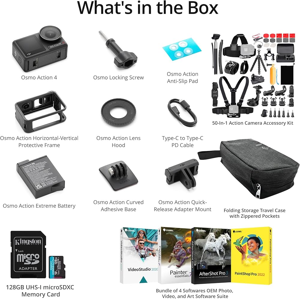 تشمل الحزمة: مجموعة DJI Osmo Action 4 Camera القياسية ، مع حزمة من 4 صور ، فيديو ، وبرغات فنية ، مجموعة ملحقات كاميرا 50 في 1 ، حالة سفر تخزين قابلة للطي وبطاقة microSD 128 جيجابايت