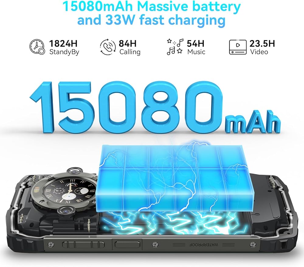 【15080mAh بطارية طويلة الأمد و 33 واط الشحن السريع/OTG】 تتميز الهواتف المقفلة الوعرة التي تم فتحها بضرائب 15080mAh فائقة الدقة ، و 33 واط الشحن السريع ووظائف OTG لضمان ساعات طويلة من الألعاب غير المنقطعة ، وتصفح الويب واستخدام الوسائط المتعددة. توفر رسوم واحدة ما يصل إلى 1824 ساعة من وقت الاستعداد ، و 84 ساعة من وقت الحديث ، و 54 ساعة من تشغيل الموسيقى و 23.5 ساعة من تشغيل الفيديو. مع هذه البطارية عالية السعة ، يمكنك الاستمتاع بساعات من الألعاب ، ودفق أفلامك وعروضك المفضلة ، وتصفح الويب دون قلق الطاقة. بالإضافة إلى ذلك ، يتميز هاتف الألعاب هذا 33W بسرعة شحن حتى تتمكن من شحن جهازك بسرعة والعودة إلى الألعاب. كما يدعم وظيفة OTG.