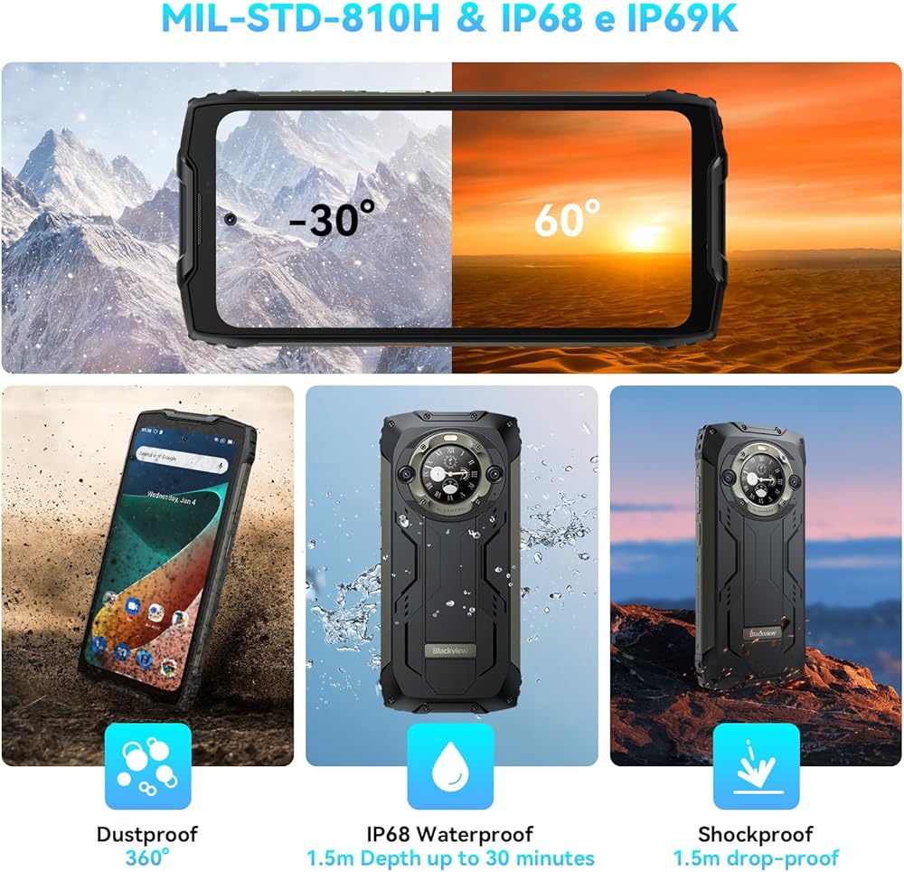 IP69K Froofrackproof IP68 IP68 PRACKBRAINT WATREPROOT】 The BV9300 Pro هو أحدث معايير MODENT ATMED STOMDER 2023 يتبع معايير MIL-STD-810H و IP68/IP69K للمتانة المتميزة. مع القدرة على تحمل انخفاض 1.5 متر ، وحماية من الغبار بزاوية 360 درجة ، و 30 دقيقة من مقاومة الماء على عمق 1.5 متر ، يمثل هذا الهاتف هاتفًا متشابهًا للغاية. BV9300 ، ولكن أيضا ميزات ترقية وتحسين المواد والمواد. كما أنه يتميز بـ Corning Gorilla Glass 5 للحصول على حماية أفضل للمنزل. هذا الهاتف الذكي الوعرة لعام 2024 يلفت التوازن المثالي بين الوعرة والوظائف.