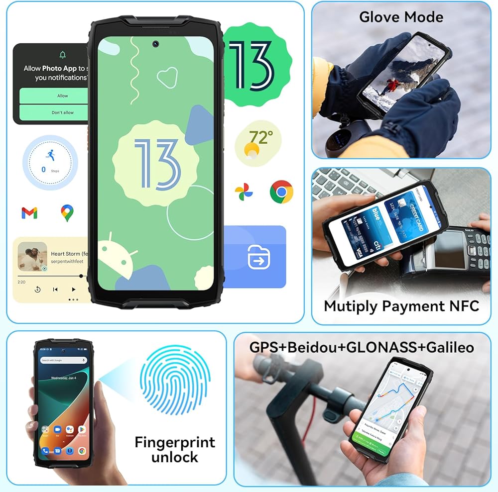 【وضع بصمات الأصابع/وضع NFC/GLOVE/GPS】 يوفر الهاتف الوعرة غير المقفلة وصولًا مريحًا وآمنًا مع ميزة فتح بصمات الأصابع ، يمكنك فتح هاتفك بسرعة وبدون عناء. بالإضافة إلى ذلك ، يتيح لك NFC للهاتف الذكي الوعرة NFC إجراء مدفوعات لا تلامس بسهولة وملفات التحويل وما إلى ذلك. يمكّنك وضع قفاز BlackView Onlocked من استخدام الهاتف حتى في الطقس البارد أو غيرها من البيئة أثناء ارتداء القفازات. علاوة على ذلك ، فإن الهواتف الوعرة Bv9300 Pro لديها GPS+Beidou+Glonass+Galileo Mavigation ، مما يوفر قدرات دقيقة على تحديد المواقع والتنقل التي تضمن الوصول إلى وجهتك بسهولة.