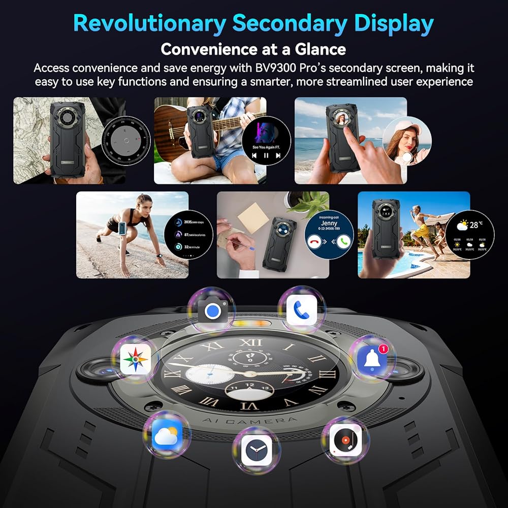 【1.32 "شاشة ثانوية مخصصة و Airbuds المجانية】 الهاتف الذكي الوعرة BV9300PRO لديه شاشة على ظهرها ، وشاشة ثانوية قابلة للتخصيص مقاس 1.32 بوصة. بالإضافة إلى عرض معلوماتك المهمة وتخصيص خلفيات مختلفة ، تحتوي هذه الشاشة على العديد من الاستخدامات العملية. مثل هذه الشاشة. نظرًا لاستخدام البوصلة ، وتطبيق الإشعارات والتذكيرات ، والرد على المكالمات ، وتشغيل الموسيقى ، والوصول إلى تحديثات الطقس ، ومساعدة الصور الشخصية والمزيد. كمية سماعات الأذن اللاسلكية اللاسلكية وستتلقى 𝐅𝐑𝐄𝐄 𝐖𝐢𝐫𝐞𝐥𝐞𝐬𝐬 𝐖𝐢𝐫𝐞𝐥𝐞𝐬𝐬.