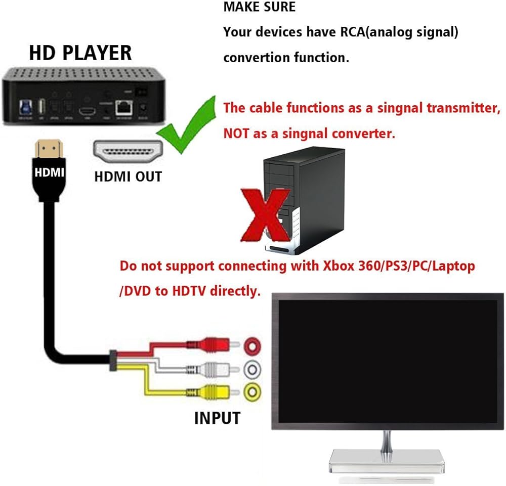 1. This HDMI to RCA cable lead functions as a signal transmitter, but NOT a signal converter.