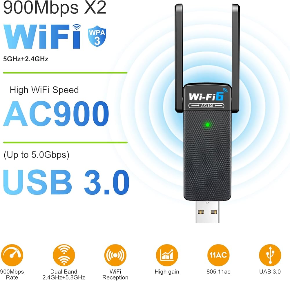 نطاقات مزدوجة النطاق 5.8 جيجا هرتز و 2.4 جيجا هرتز- 5.8 جيجا هرتز اتصال WiFi تصل إلى 600 ميجابت في الثانية ، و 2.4 جيجا هرتز 286 ميغابت في الثانية ، مع هذه السرعات التي تمت ترقيتها ، وتجربت جلسات الأزهار على شبكة الإنترنت ، والألعاب ، والبث عبر الإنترنت أكثر متعة ، دون التخزين المؤقت أو المقاطعات ، عالية Wi- سرعات FI الخاصة بـ AX1800 WiFi Dongle توفر سرعات إنترنت أسرع واختراق إشارة أقوى وأكثر موثوقية للمسافة الطويلة. هذا محول Gigabit WiFi USB للكمبيوتر ، مثالي للمستخدمين المعاصرين