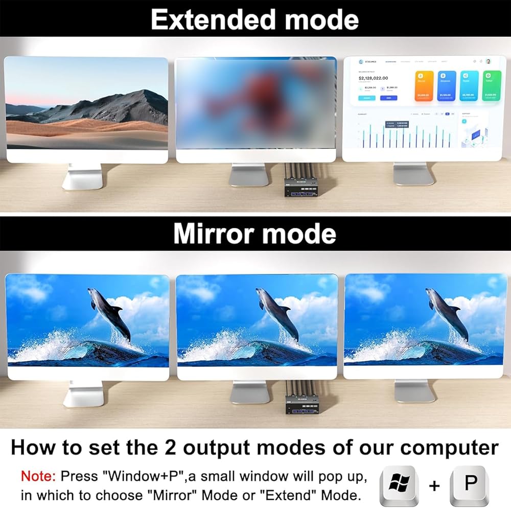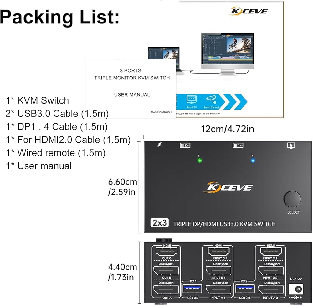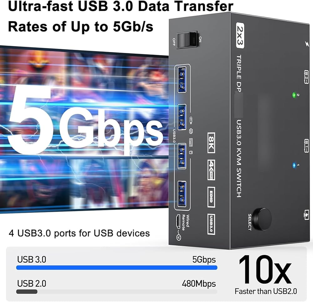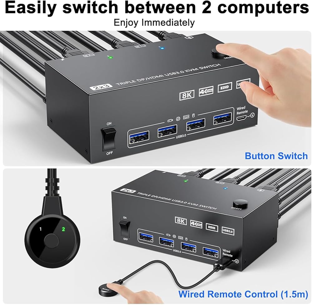 مفتاح KVM ، USB3.0 kVM Switch 3 مخرجات شاشة ، عرض جدار الفيديو سهولة التبديل ، صورة ناعمة ، معدن أسود (أسود #AU)
