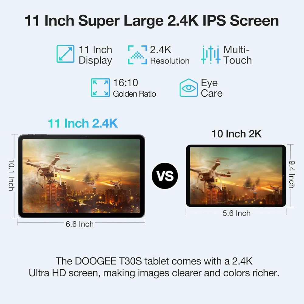 【11 بوصة 2.4 كيلو فايس شاشة IPS , 7.6 مم جسم معدني رفيع للغاية】 Doogee T30S Android Tablet يتميز بجسم معدني عالي الجودة و 11 بوصة IPS 2.4 كيلو باس يقلل من التعب العين والتهيج. يزن جهاز Android Tablet T30S Lightwight Worroid 506 جرامًا فقط ويبلغ سمكه 7.6 مم فقط.