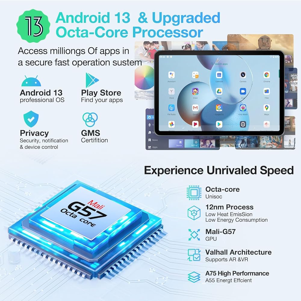 【2024 تم ترقية Android 13 + معالج ثماني النواة القوي】 Doogee T30S Gaming Android Tablet يتم تشغيله بأحدث Android 13. مقارنةً بـ Android 12/11 ، تعمل Android 13 Tablets بشكل أسرع ، وحماية الخصوصية والأمان ، وتوفر أكثر تخصيصًا وسهولة -تجربة نظام التشغيل. يعتمد T30S Tablet معالجًا قويًا ثماني النواة بنسبة 1.6 جيجا هرتز مع A75 Architecture Core. مع الأداء العالي والاستهلاك المنخفض للطاقة ، فإنه يدعمك أن تلعب جميع أنواع ألعاب اللوحات دون القلق بشأن التأخر.