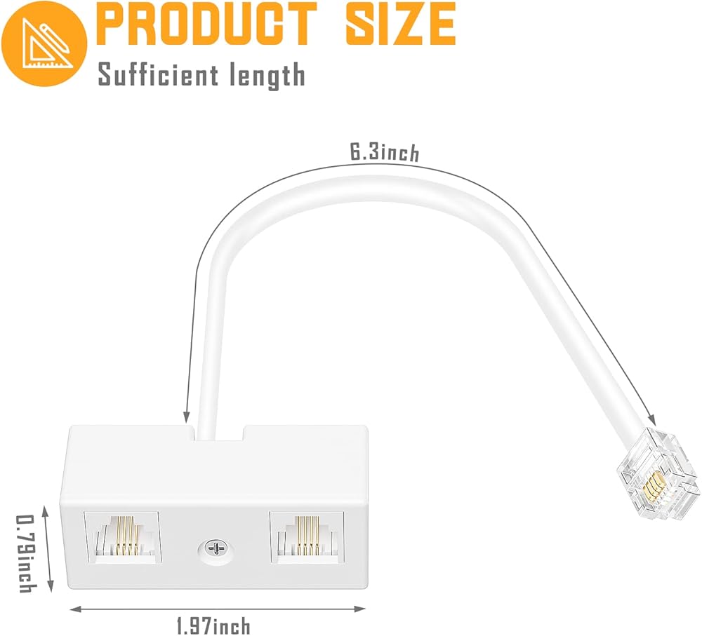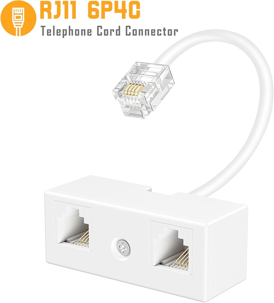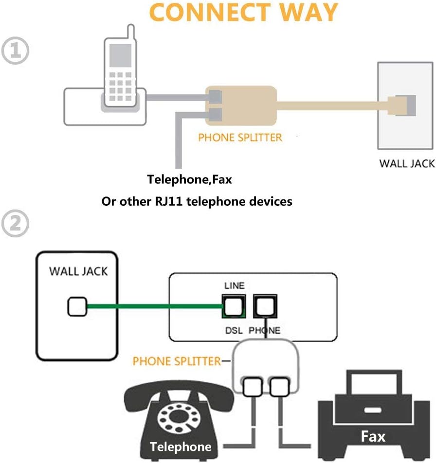 سهل الاستخدام: جهاز تقسيم الهاتف Uvital سهل الاستخدام للغاية. ما عليك سوى توصيل المحول بمقبس الهاتف RJ11 وتوصيل كابلات RJ11 (غير مرفقة) بالمحول. أحد الطرفين هو قابس ذكر 6P4C والطرف الآخر عبارة عن مقبسين 6P4C RJ11.