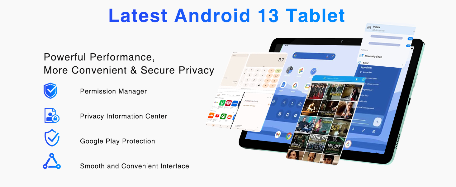 【Android 13 Tablet Privacy and Security】 Doogee T10e 10 بوصة الكمبيوتر اللوحي 10 يستخدم أحدث نظام تشغيل Android 13 (GMS معتمد) لزيادة تجربة المستخدم وخصوصية المستخدم. استخدام جهاز لوحي Android 13 أكثر سلاسة وأسرع. تجربة تطبيقات الطرف الثالث المفضل مثل Netflix/YouTube/Facebook/Twitter.