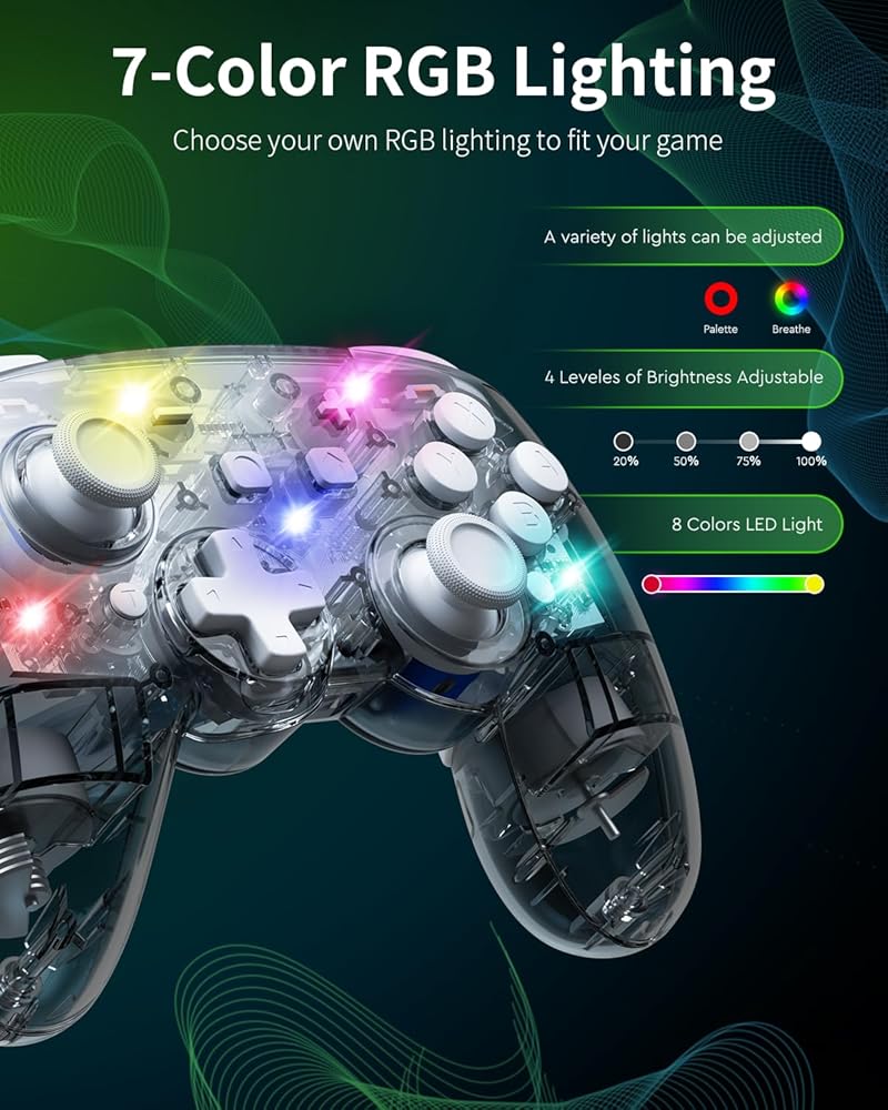 7 مصباح LED للتنفس: يتميز وحدة تحكم RGB ، المصنوعة من مواد الكمبيوتر الشفافة المتينة ، 7 شرائح مصباح LED مدمجة تخلق جو ألعاب غامرة. يمكنك تخصيص الألوان لتعزيز تجربة الألعاب الخاصة بك.