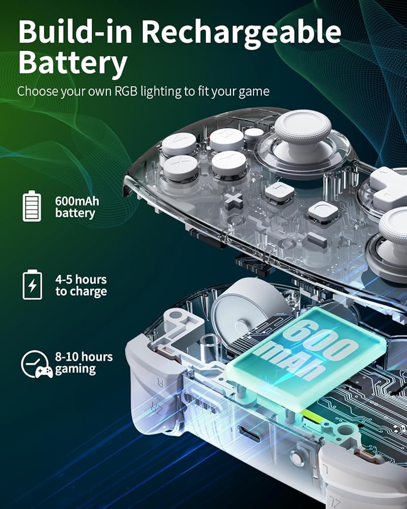 البطارية والاتصال اللاسلكي: يتميز بطارية 600 مللي أمبير في الساعة قابلة لإعادة الشحن ، وهي وحدة تحكم التبديل اللاسلكي هذه توفر 8-10 ساعة من اللعب على شحن كامل. استمتع بحرية الألعاب اللاسلكية مع نطاق 10 أمتار.