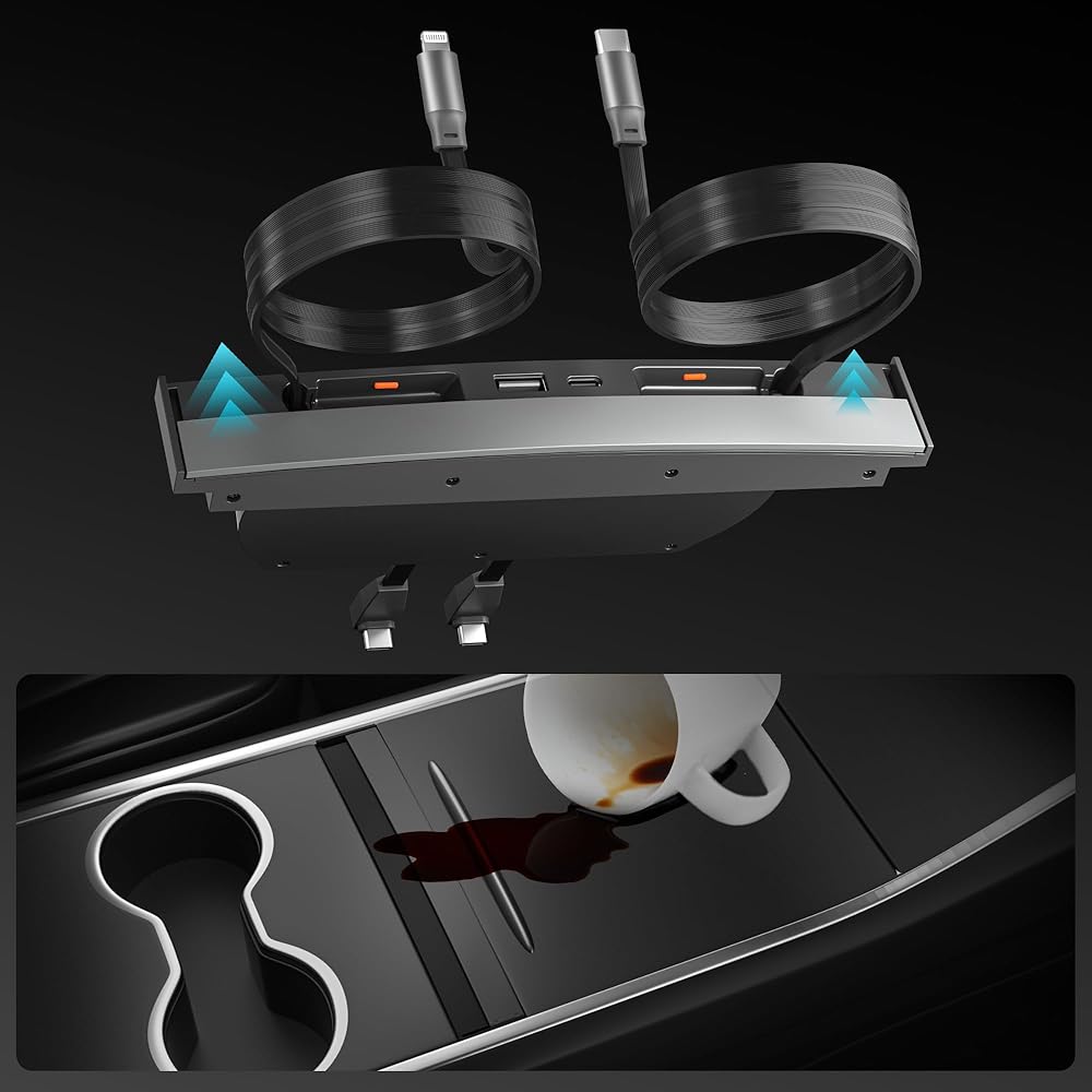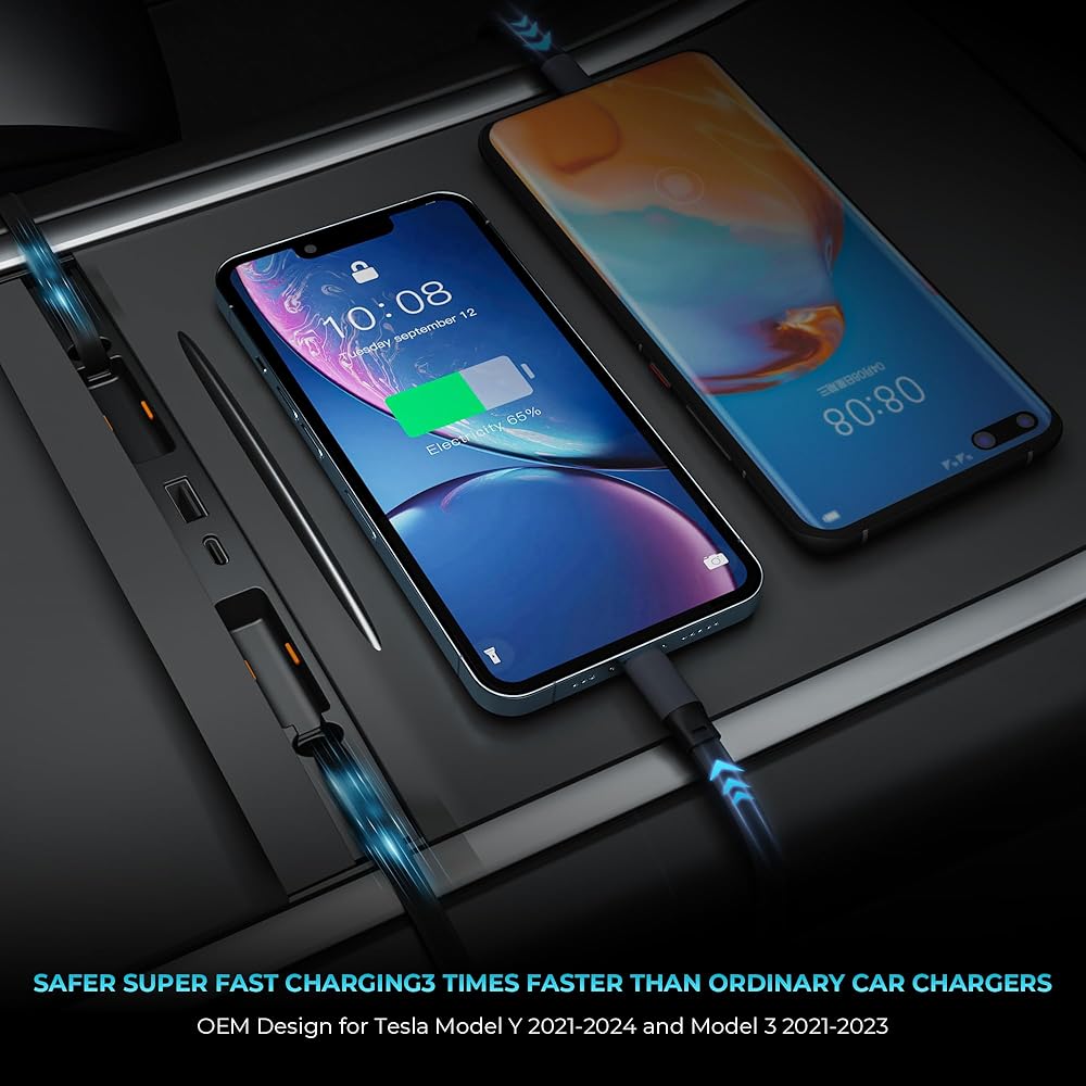 【4 أجهزة شحن في نفس الوقت】 Tesla Model Y Model 3 Accessories 2024 يحتوي الشاحن السريع على كبلتين للشحن ومنافذ شحنان ، يمكن استخدامه للنوع C USB ، الشحن اللاسلكي داخل السيارة يصل إلى أربع مرات أسرع ، إذا كان لا يمكن شحن كابل الشحن القابل للسحب ، يرجى التحقق مما إذا كان يتم توصيل منفذين الطاقة بإحكام.
