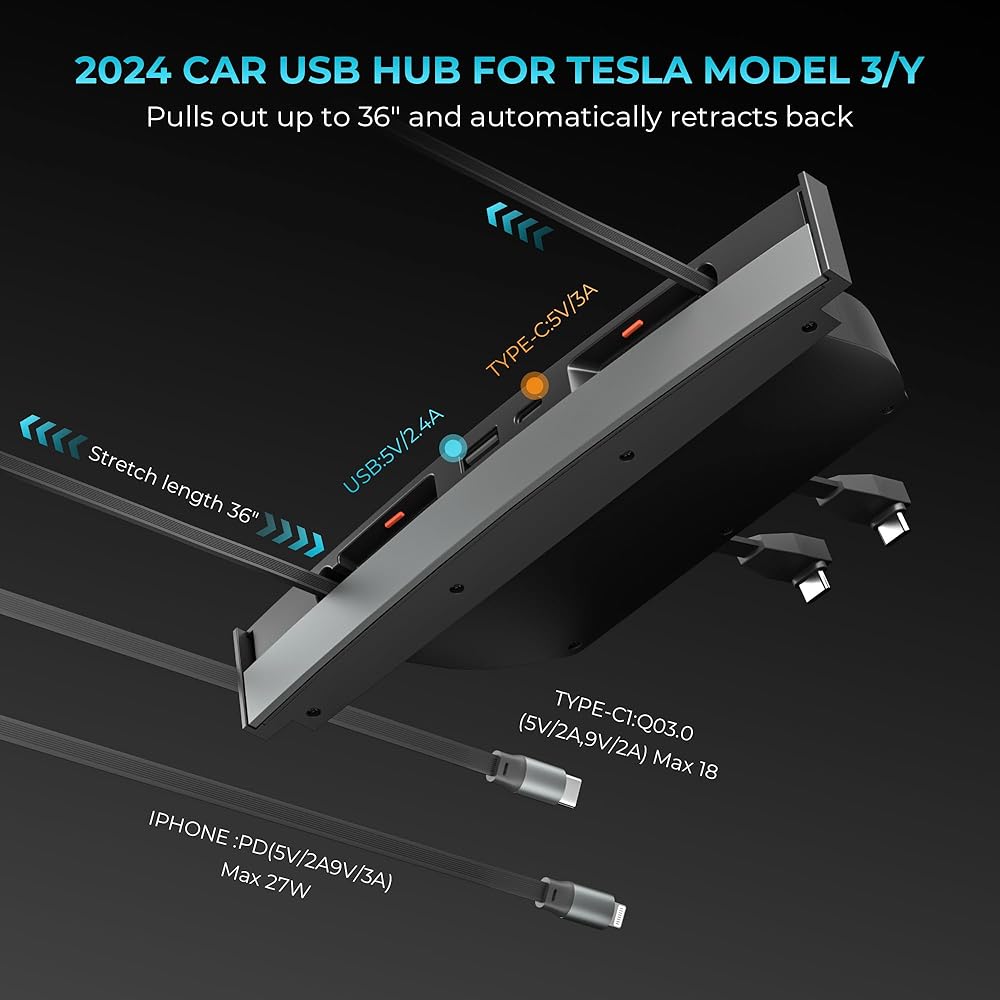 【كابلات الشحن القابلة للسحب】 محور USB للسيارة لوحدة التحكم المركزية Tesla هو فريد من نوعه على الغطاء المقاوم للتربة المصمم ، يحتوي على كبلتين شحنات قابلة للسحب ، والتي يمكن تمديدها إلى 32 بوصة وتتراجع تلقائيًا.