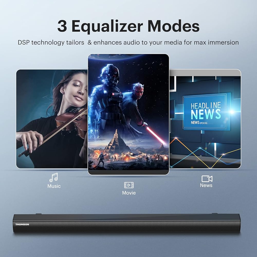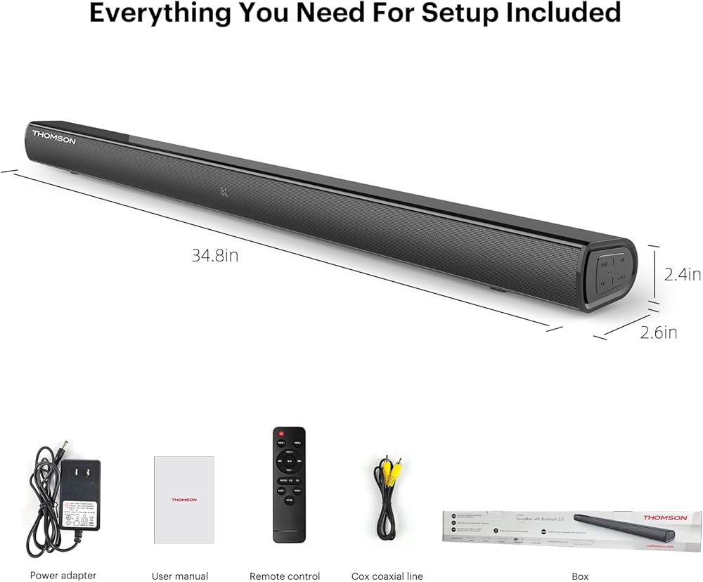 أشرطة صوت طومسون للتلفزيون، مكبرات صوت للمسرح المنزلي مقاس 35 بوصة مع مكبر صوت انعكاسي، بلوتوث 5.0، صوت DSP وقابل للتعديل على الحائط، HDMI/ARC/AUX/Opti/Coax/USB