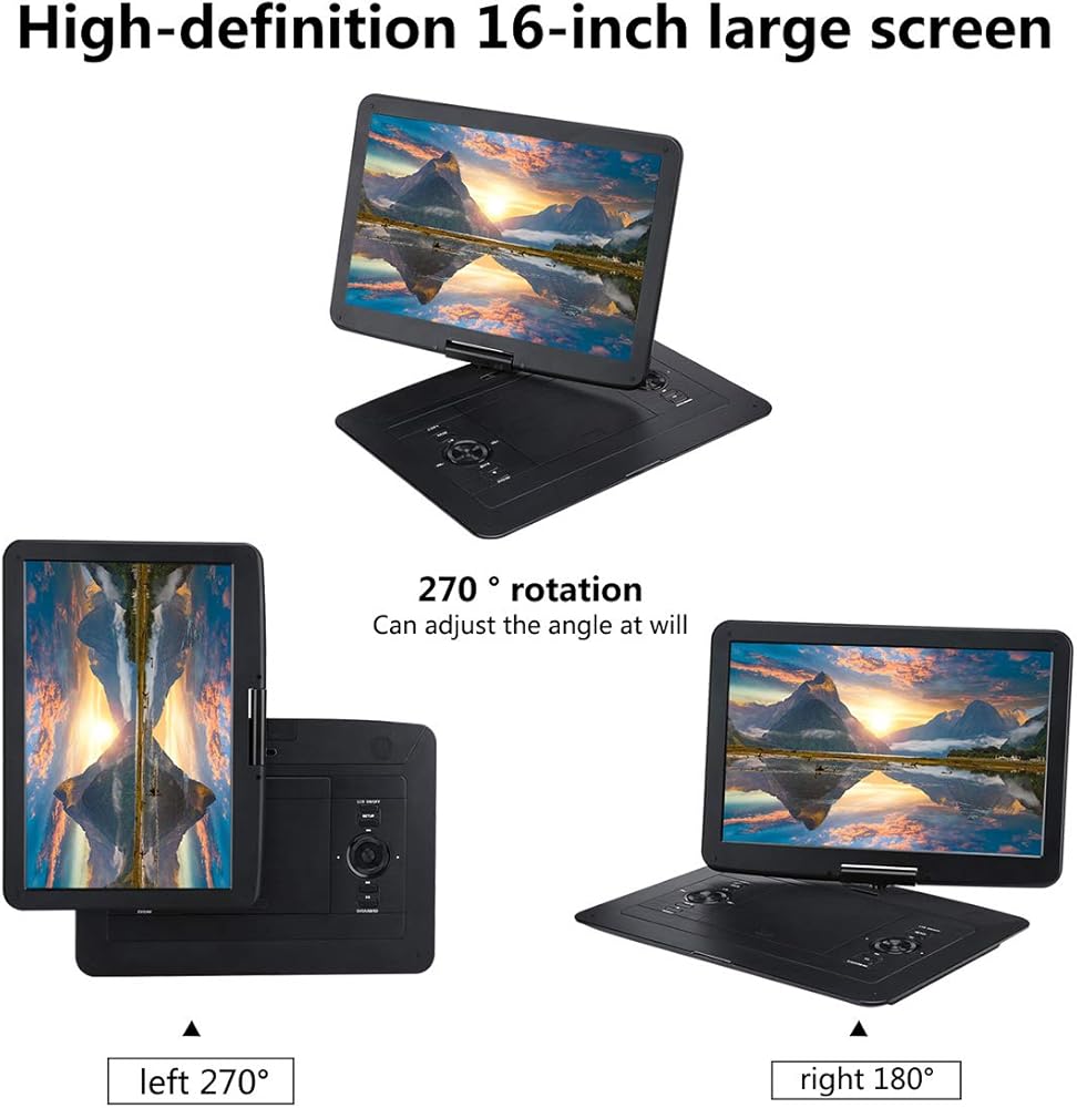 شاشة دوارة: مشغل DVD YOOHOO مقاس 17.9 بوصة يستخدم شاشة LCD واقية للعين مقاس 15.6 بوصة، ويمكن أن تصل الدقة إلى 1280*800؛ اضبط زاوية الرؤية بحرية حسب حاجتك، حيث يسمح لك الدوران بزاوية 270 درجة والقلب بمقدار 180 درجة بالحصول على الرؤية المثالية.