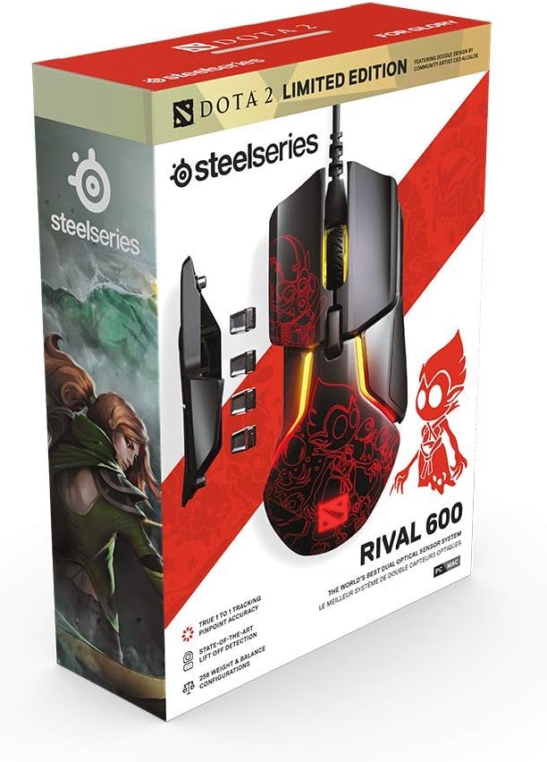 SteelSeries teamed up with Valve to develop the limited Dota 2 edition Rival 600 featuring a design by community artist Ced Alcalde. The dual-sensor system combines true 1 to 1 tracking with breakthrough state-of-the art lift off distance detection. Rival 600 also features an exclusive custom center-of-gravity tuning system with 256 weight configurations and a customizable range from 96g to 128g, ensuring the perfect weight and balance for everyone. SteelSeries Engine software unlocks an impressive arsenal of Engine Apps that make customization easy and intuitive.