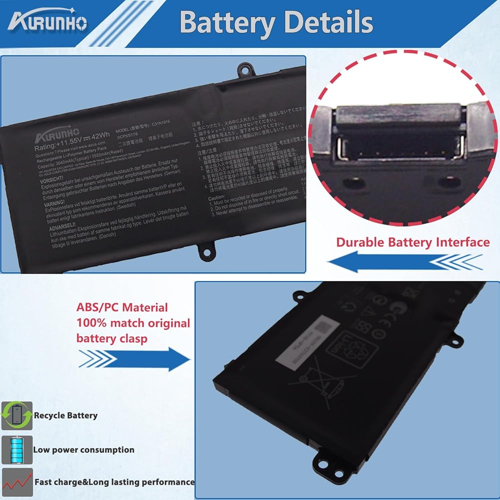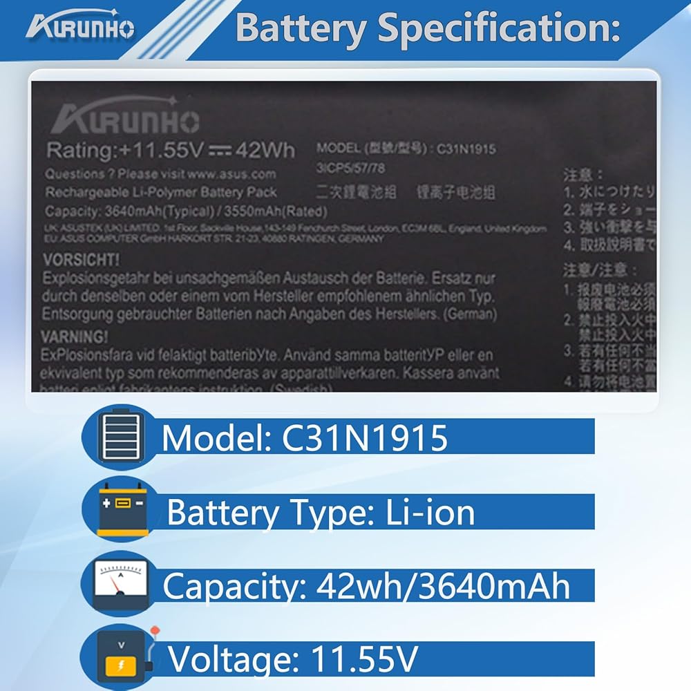 【C31N1915 مواصفات البطارية】 النموذج: C31N1915. الجهد: 11.55 فولت. السعة: 42WH/3640mAh. اللون: أسود. 100 ٪ العلامة التجارية الجديدة من الشركة المصنعة.