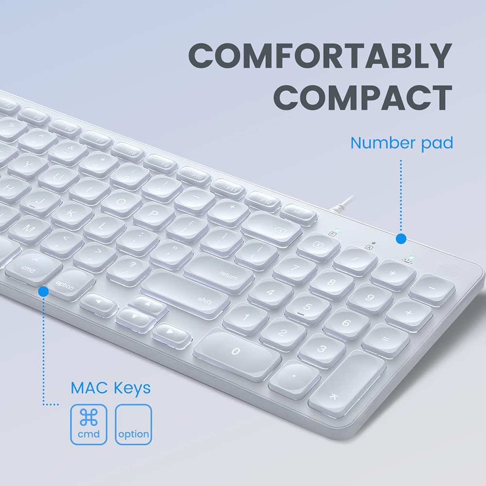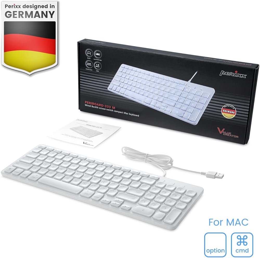 Perixx Periboard -333MW لوحة مفاتيح USB Backlit Lacklit - متوافقة مع أجهزة Mac OS X و iOS - مفاتيح مقص مع خط كبير - مضغوط 14.25x4.57x0.83 بوصة - الإضاءة الخلفية البيضاء