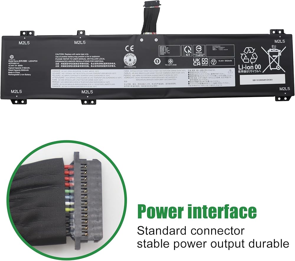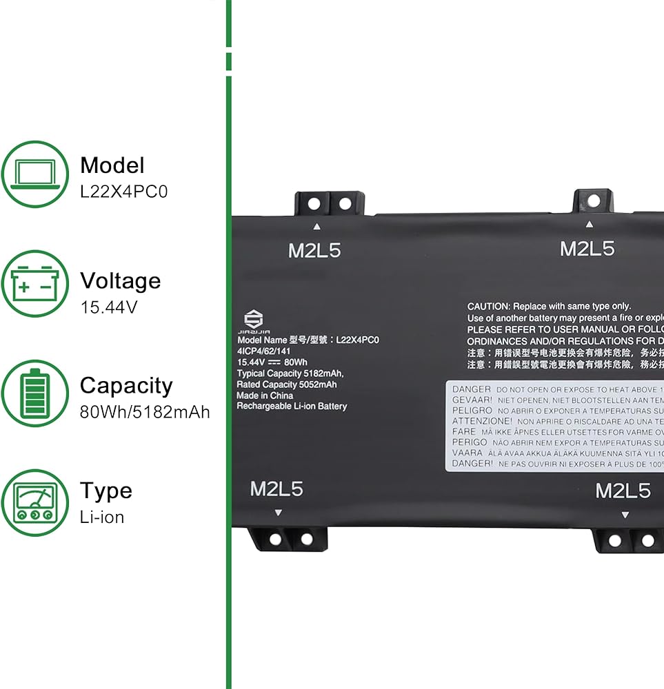 • Model: L22X4PC0 // Voltage: 15.44V // Capacity: 80Wh 5182mAh // Color: Black // Type: Plug & Play Li-ion Battery.