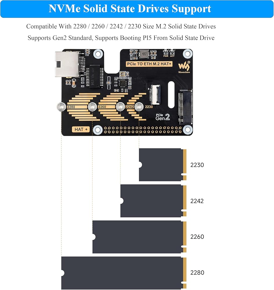 • متوافق مع 2280 /2260 / 2242/2230 حجم M.2 محركات الأقراص الصلبة. يدعم Gen2 Standard ، يدعم تشغيل PI5 من محرك الحالة الصلبة.