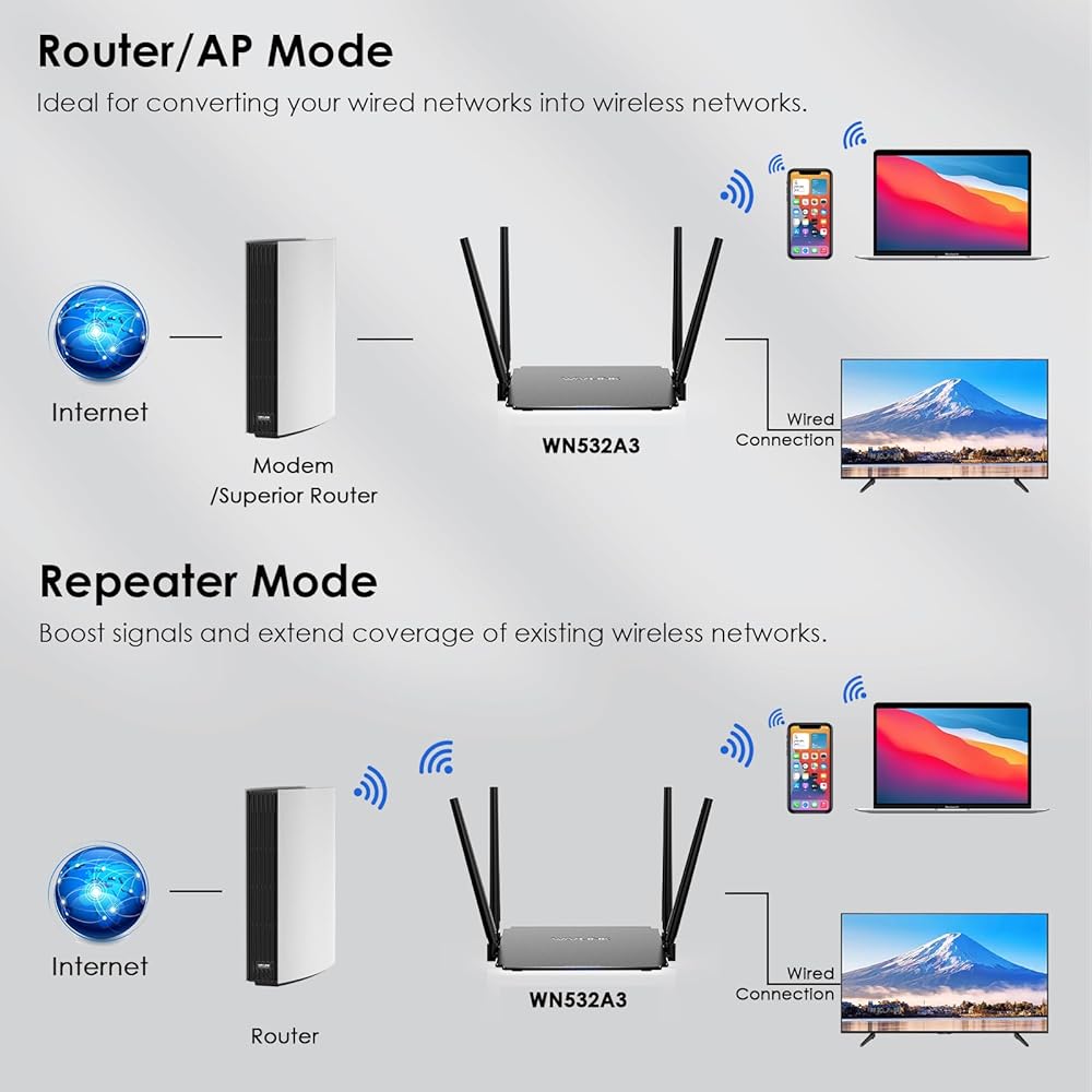 • 【أوضاع التشغيل متعددة الاستخدامات】 قم بالتبديل دون عناء بين أوضاع جهاز التوجيه و AP وكرس للتكيف مع متطلبات الشبكة المتغيرة. تساعد أوضاع Router/ Access Point (AP) على تحويل شبكتك السلكية الحالية إلى شبكة لاسلكية. يعمل وضع المكرر على تضخيم وتوسيع نطاق شبكتك اللاسلكية الحالية ، مما يوفر اتصال Wi-Fi المحسّن حتى في المناطق التي يصعب الوصول إليها.