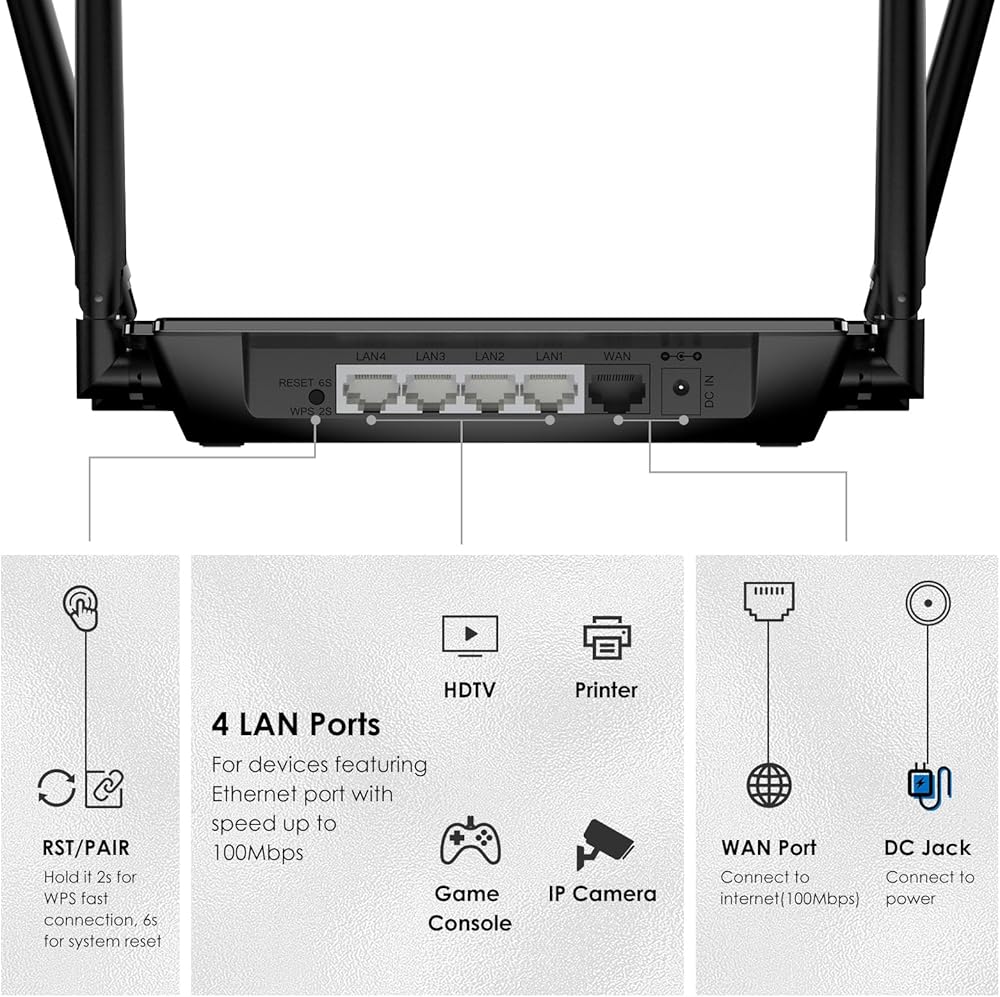 • 【تجربة WiFi 5 سرعة لا مثيل لها】 تسخير قوة تقنية WiFi 5 للاستمتاع بسرعات لاسلكية مجتمعة تصل إلى 1200 ميجابت في الثانية ، وضمان تجارب التصفح والبث والألعاب السلس. الاستفادة من انخفاض الكمون وأوقات الاستجابة الأسرع ، مما يتيح لمكالمات ألعاب أكثر سلاسة عبر الإنترنت ومكالمات فيديو خالية من التأخر. تسمح لك 4 منافذ LAN (10/100 ميجابت في الثانية) بالاتصال بأجهزتك السلكية مباشرة.