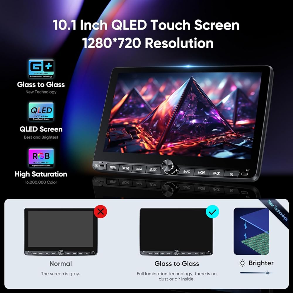 【4+64 جيجا بايت ، 10.1 "Qled Display】 نظام التشغيل Android 12. يتميز راديو السيارة هذا بنسبة 8 نور Cortex A55 ، وذاكرة RAM أصلية 4 جيجابايت وذاكرة ROM 64 جيجابايت توفر لك تجربة أسرع وأكثر سلاسة. ، دقة 10.1 بوصة 1280 × 720 ، تقنية التصفيح الزجاجية+الزجاج الكامل ، لا يوجد غبار أو هواء في الداخل ، زاوية عرض كاملة 178 درجة ، تجلب لك تجربة بصرية ممتازة.