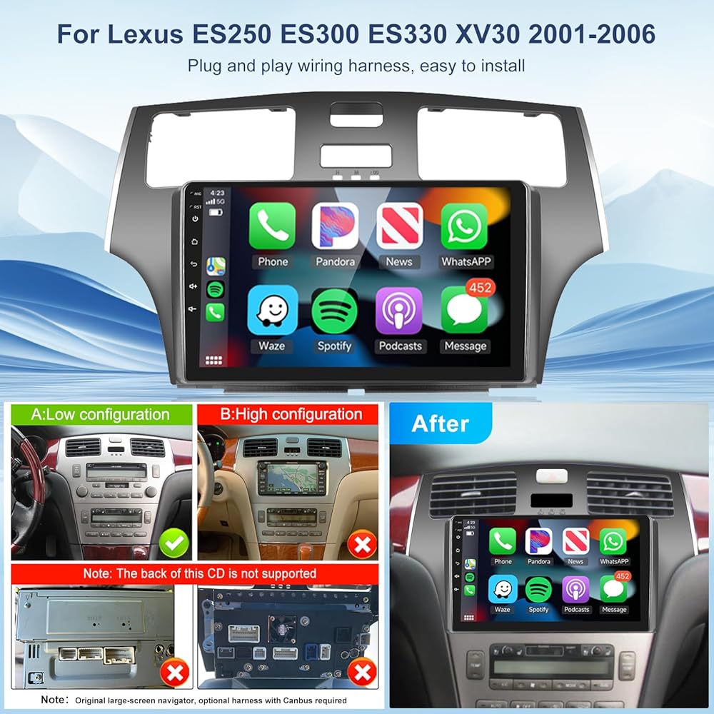 2+64G- لـ LEXUS ES250 ES300 ES330 XV30 2001-2006 CAR RADIO CARPLAY/Android Auto ، Sterroid Car Stereo 9inch Touch Screen GPS Savigation WiFi Bluetooth FM/RDS Link SWC Camera
