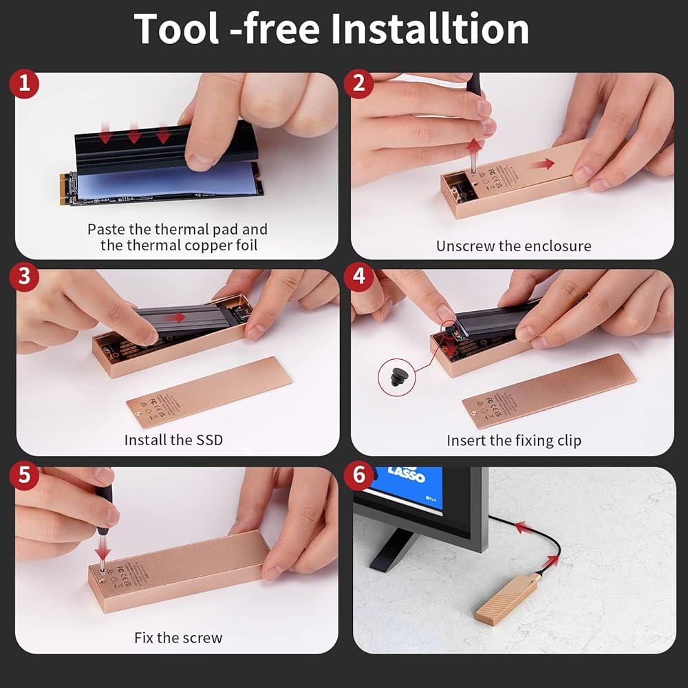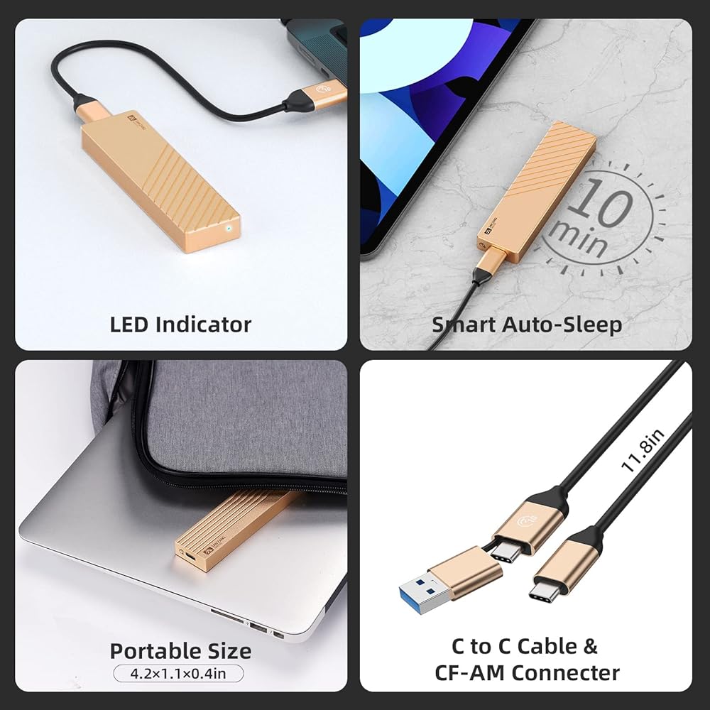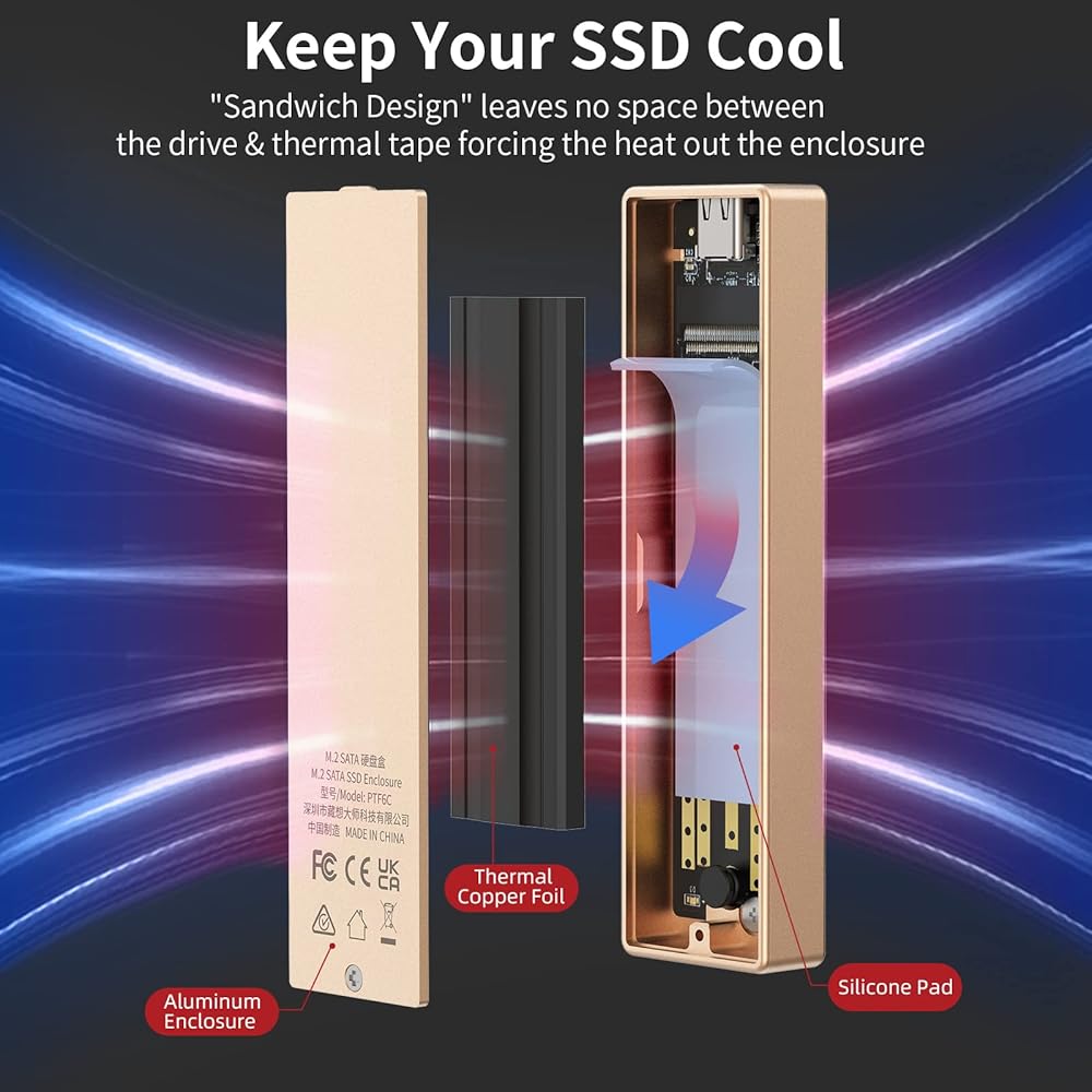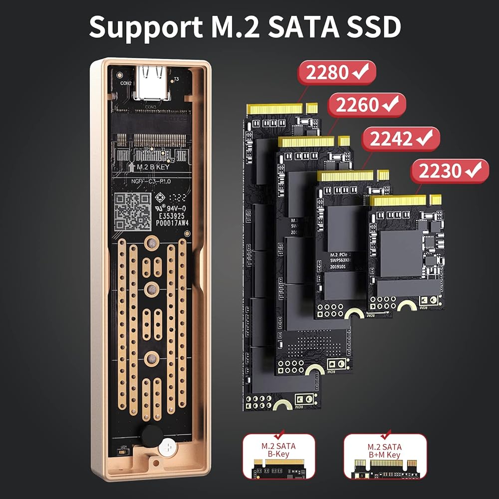 Higher Heat Dissipation Performance: Always designed with heat dissipation performance in mind. The unique stripe design make its surface area larger than other m2 sata enclosure, increasing its effective heat dissipation area by 30%. And a thermal pad is provided. Aims to keep the temperatures low, ensuring that SSD performance won't be compromised. Plug and Play: No need drivers, support Hot-swap, easy to use Power Expand: The Ultra-Compact m2 ssd enclosure High-Speed File Transfer: Insert your M.2 NGFF SATA SSD into the m2 enclosure and connect to your laptop's USB-C port to transfer movies, music, and more at speeds of up to 6 Gbps. Wide Compatibility: Compatible with M.2 NGFF SATA protocols, SSDs with B Key or B&M keys, and size 2230 / 2242 / 2260 / 2280 SSDs. Not compatible with NVME or PCIe AHCI SSDs. Lightweight and Slim: The Weight is 0.11lbs, and the measure is 4*1*0.5 inch, you can easily carry m2 usb c enclosure with you to access your files whenever you need. How to Install 1). Release screw to open the enclosure. 2). Insert your SSD into the slot. 3). Insert the fixing clip to secure the SSD in place. 4). Paste the thermal pad 5). Paste the heat sink 6). Fix the screw Compatibility: MacBook Pro, MacBook Air, iPad Pro, XPS, Spectre, S20, S20 Ultra, Notebook 9 (950XBE), Pixel 3XL, Pixel 4, Yoga 720, X1, MateBook X Pro. Notes: To open the casing, you must first unplug the cable.