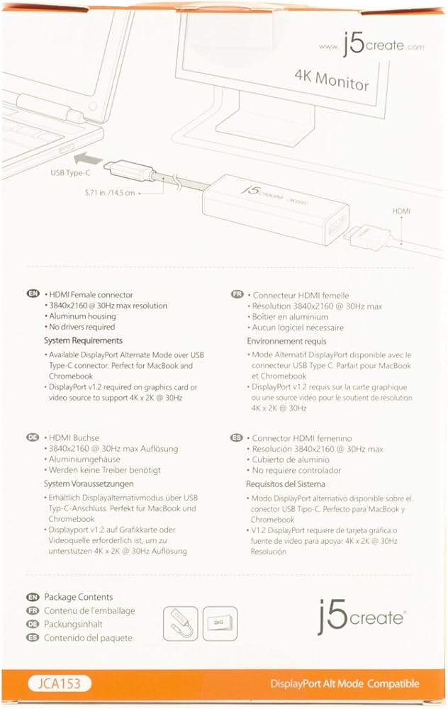 j5create's USB Type-C to VGA(1080P) / HDMI(4K) / DP(4K) / DP with Cable(4k) display adapters allow you to quickly and easily connect your MacBook, Chromebook, Tablet or PC to an external monitor, HDTV, projector or other display device using a VGA,HDMI or DP input. j5create's USB Type-C display adapters enable you to output high-definition VGA(1080P) / HDMI(4K) / DP(4K) video from your MacBook, Chromebook, and other laptop and desktop computers with a USB-C port. j5create's JCA111, JCA153, JCA140 and JCA141 adapters offer a cost-effective Type-C ALT Display Port (DP) to VGA(1080P) / HDMI(4K) / DP(4K) connection, letting you connect a VGA(1080P) / HDMI(4K) / DP(4K) computer monitor to a Type-C DisplayPort ALT Mode–equipped desktop or laptop computer, saving the expense of upgrading the monitor for compatibility.
