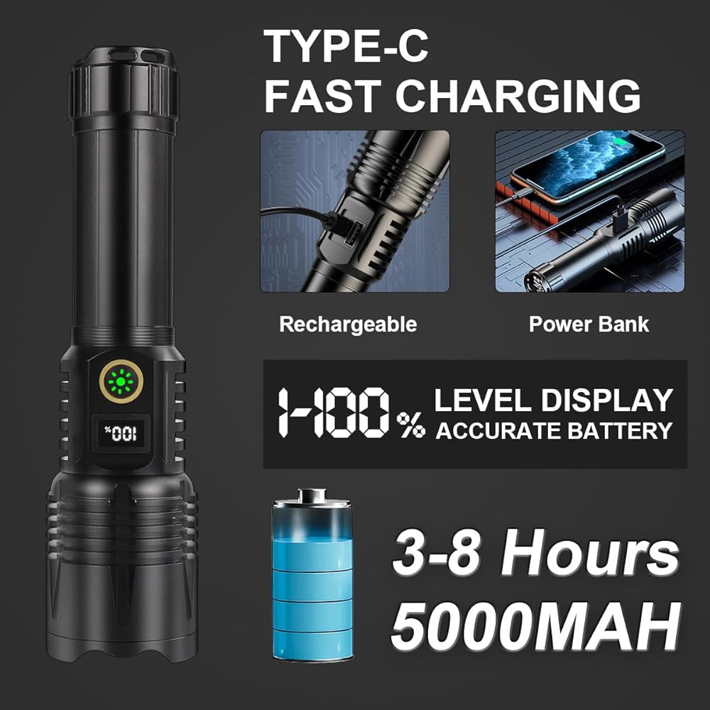 【مصباح يدوي LED Super Bright 1200000 Lumens】: قادرة على إخراج 1200000 لومن من السطوع من LED عالية الطاقة 30W. هذا الإخراج ذو الضوء العالي للغاية يجعله مثاليًا للمواقف ذات الرؤية المنخفضة للغاية ، مثل الضباب الثقيل أو الأمطار الغزيرة حيث يلزم وجود أقصى قدر من تغلغل الضوء على المسافات الشديدة. يمكن للحزمة اختيار الكائنات التي تصل إلى 1500 متر (5000 قدم) في الظلام.