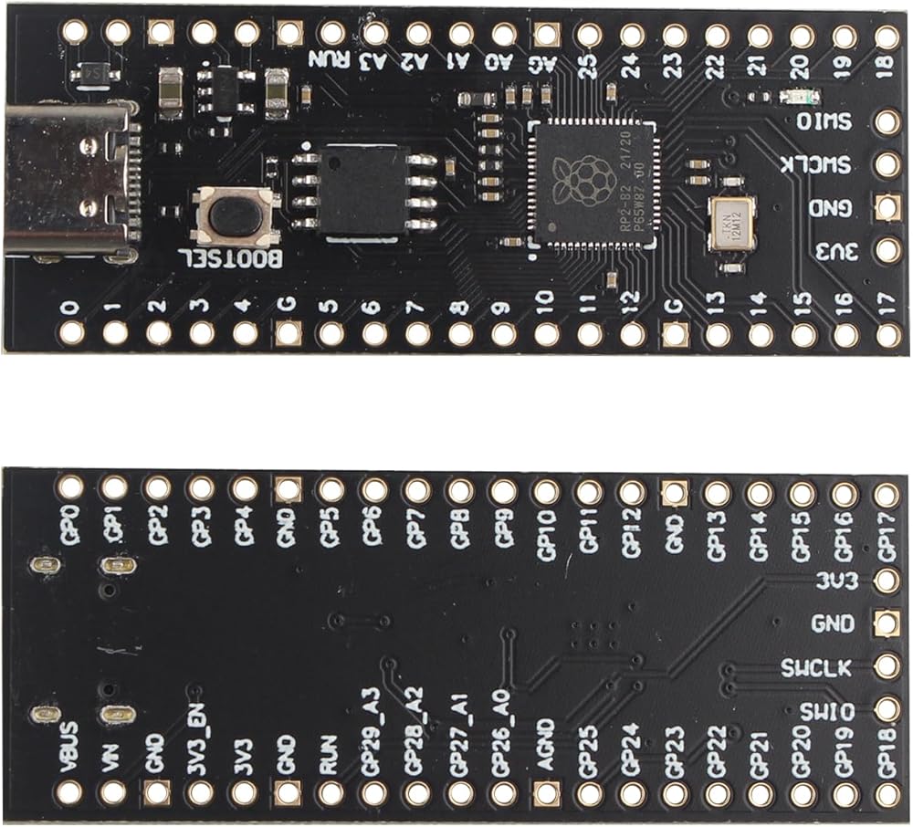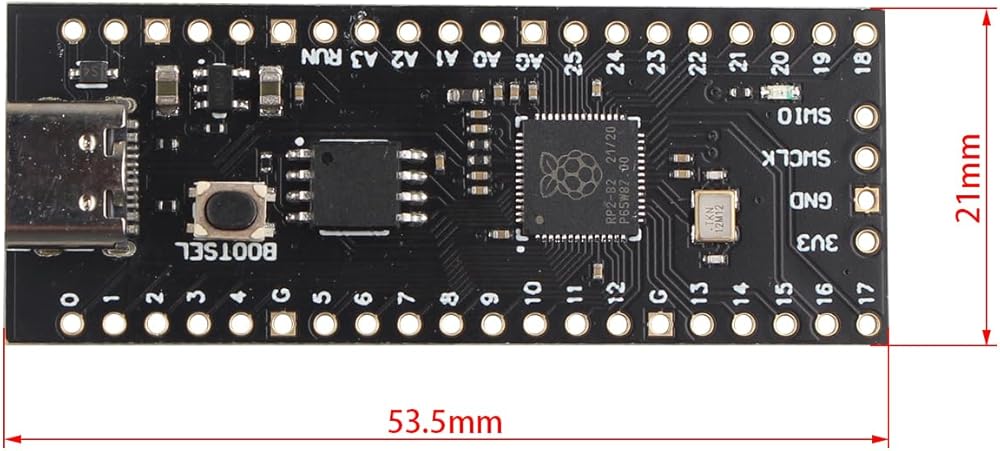 The RP2040 core board comes with 26 multi-function GPIO pins, allowing flexible development and integration. 2 × SPI, 2 × I2C, 2 × UART, 4 × 12-bit ADC, 16 × controllable PWM channels.