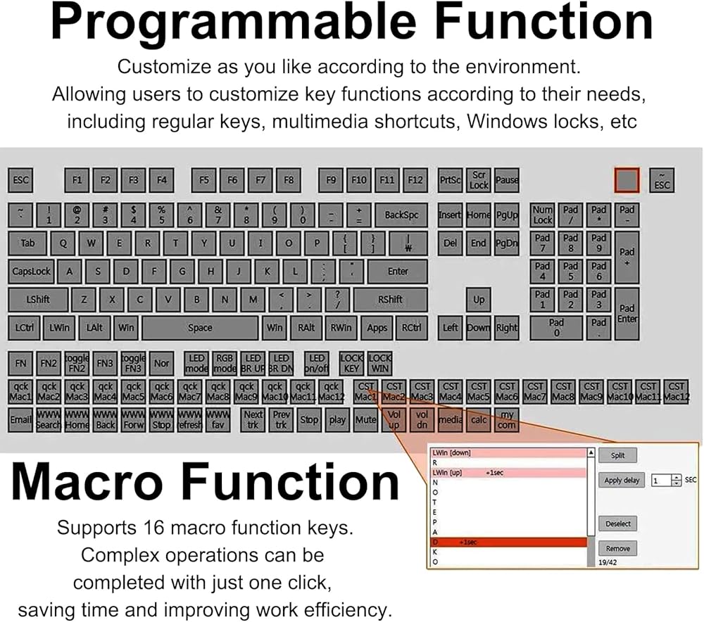 قابل للبرمجة: يمكن برمجة جميع المفاتيح الـ 24 Keys + 1 ؛ تدعم أزرار البرمجة المخصصة للمستخدمين تعيين وظائف الأزرار بحرية ، بما في ذلك 104 مفاتيح ، ومفاتيح اختصار الوسائط المتعددة ، وعجلة تمرير الماوس ، وأزرار الماوس اليسرى واليسرى ، إلخ