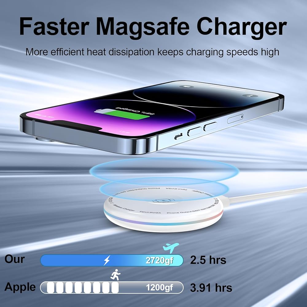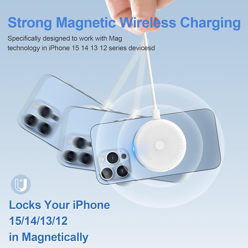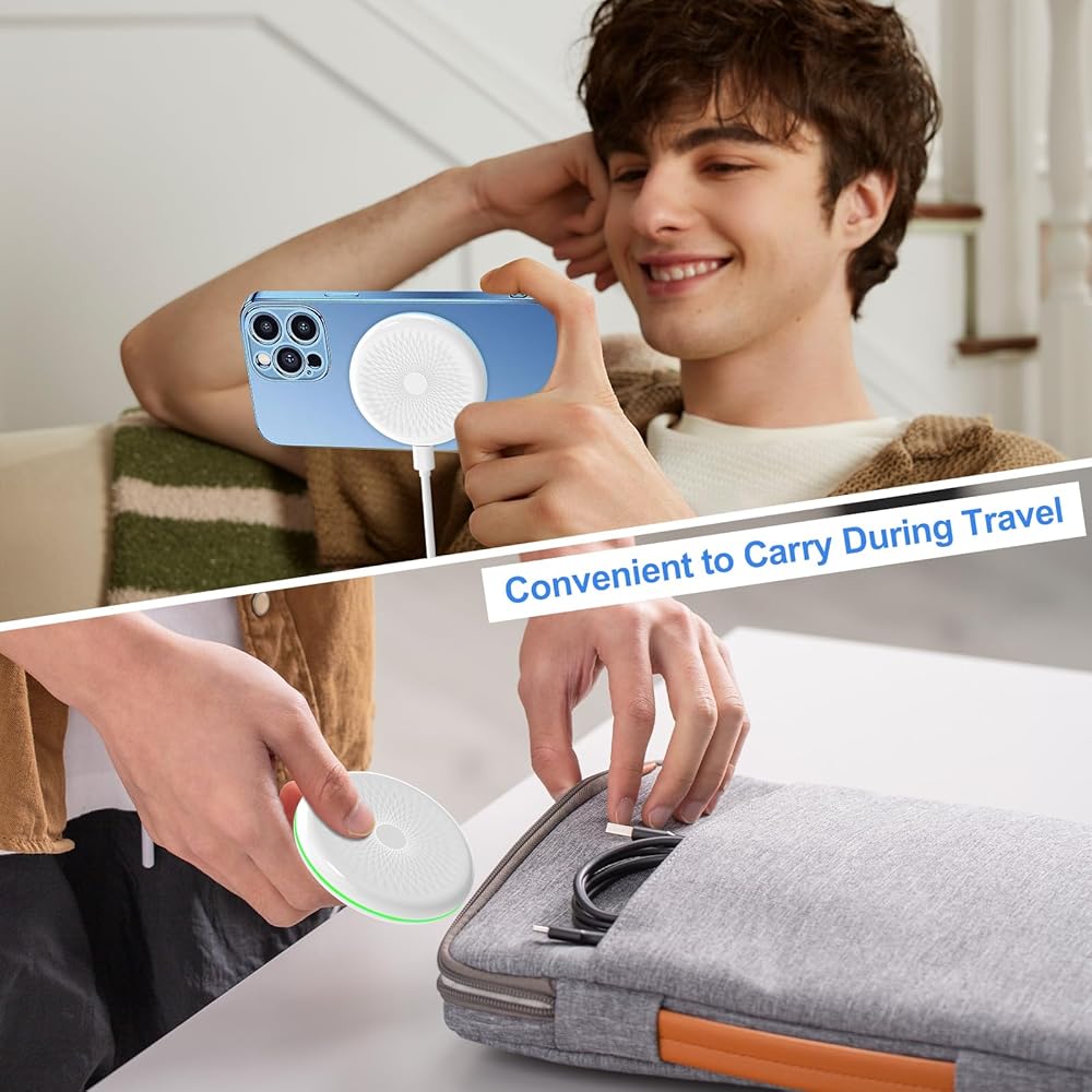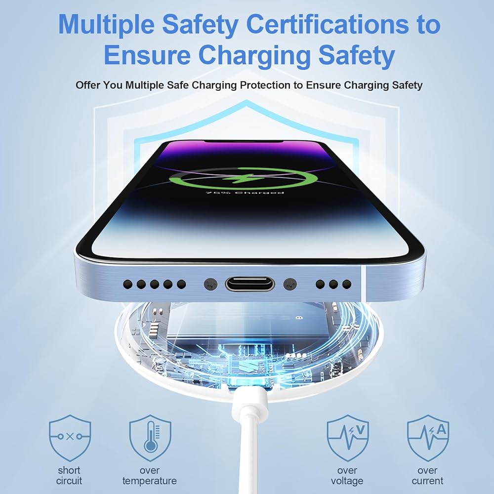 【الشحن الآمن مع شهادة FCC】 الشاحن اللاسلكي المغناطيسي معتمد من لجنة الاتصالات الفيدرالية (FCC) ، مما يضمن أنه يلبي أعلى معايير السلامة. إنه مزود بحماية ذكية متعددة ضد الشحن المفرط ، والزيادة السخرية ، والدوائر القصيرة. بالإضافة إلى ذلك ، تقاطع مجموعة الشرائح الذكية المدمجة تلقائيًا الشحن إذا كانت درجات الحرارة مرتفعة للغاية ، مما يمنحك راحة البال.