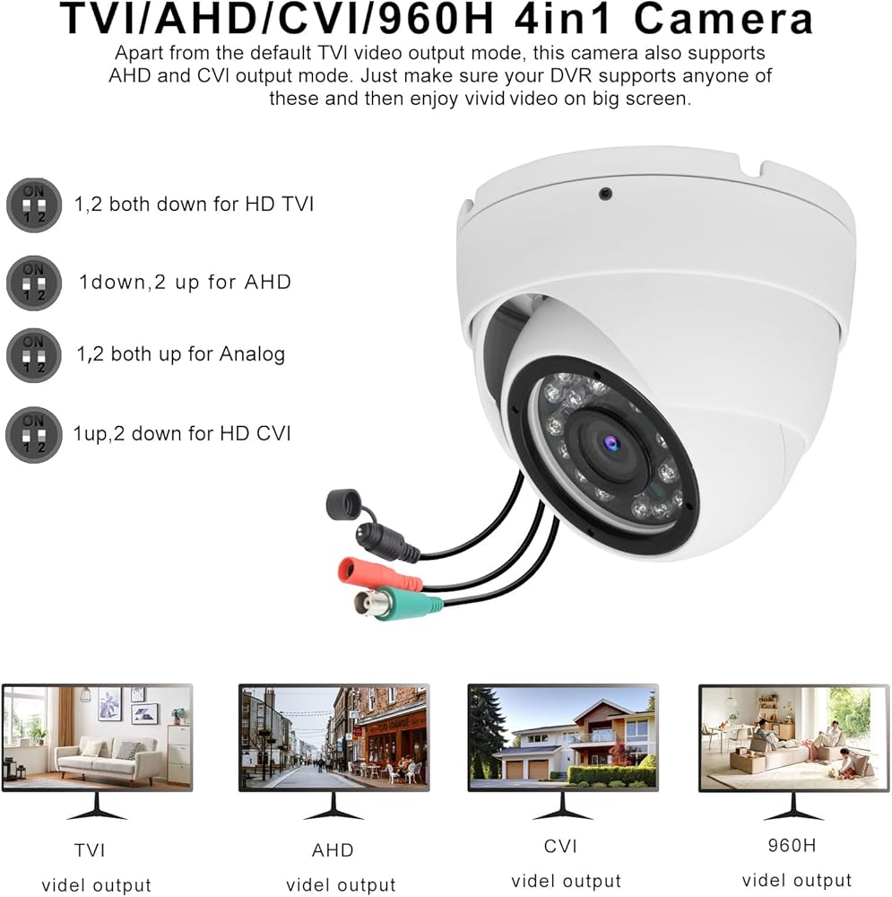 【2MP 1080p 4-in-1 CCTV كاميرا】 هذه هي كاميرا أمان تمثيلية 4-in-1 HD-CVI/TVI/AHD/960H ، وتتضمن 4 أوضاع ، وتتضمن 1080p AHD ، و 1080 بكسل CVI ، و 1080p TVI و 960H و 960H التناظرية (CVBs). (الوضع الافتراضي هو TVI. يمكنك تغيير قائمة OSD عن طريق الضغط على الزر لمدة 5 ثوانٍ تقريبًا)