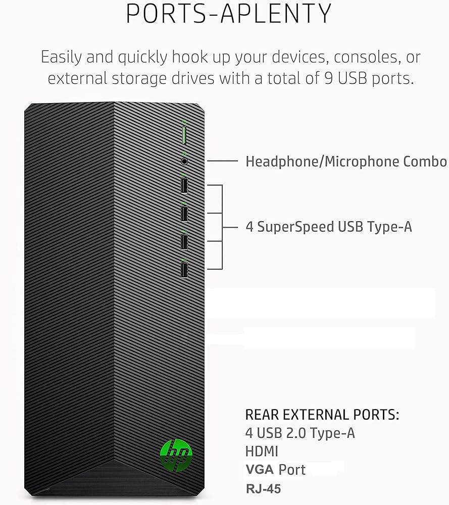 - WiFi 6 and Bluetooth. Front Ports: 4 SuperSpeed USB Type-A 3.2 Gen1, 1 headphone combo; Rear Ports: 1 HDMI, 1 VGA, 4 USB Type-A 2.0, 1 RJ-45.