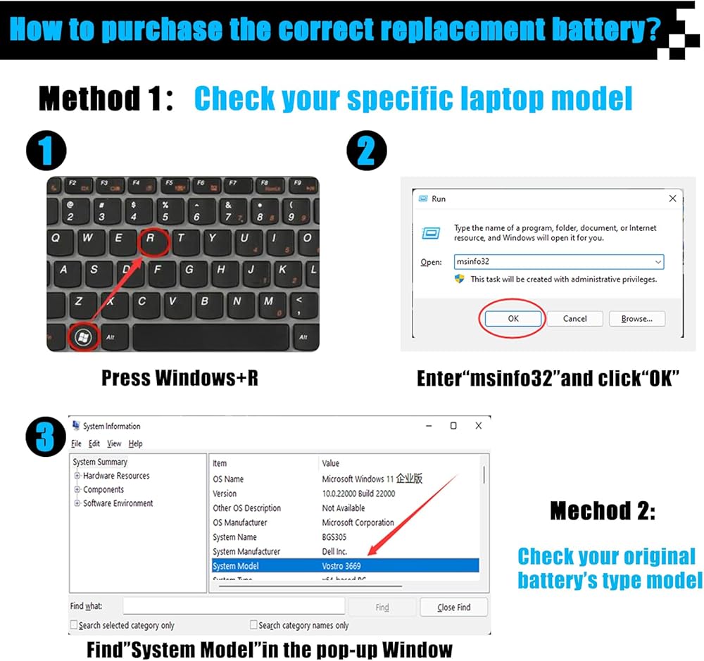 • 【ملاحظة】 يرجى فتح الغطاء الخلفي للكمبيوتر المحمول قبل الطلب والتأكد من أن طراز البطارية الأصلي يتوافق مع القائمة. بعد الحصول على البطارية ، يرجى تثبيت البطارية بشكل صحيح ، والتأكد والدورة من 3-4 مرات لإيقاظ البطارية الجديدة.