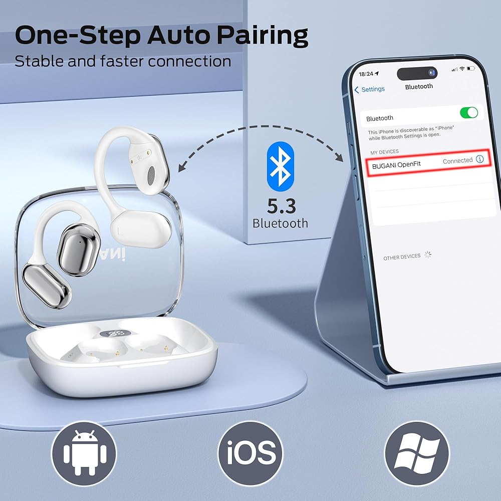 【أحدث Bluetooth 5.3】 يعتمد أحدث تقنية Bluetooth 5.3 Bluetooth وتتمتع 2 أضعاف سرعة الإرسال ، ولا يوجد فقدان إشارة أو انقطاع الموسيقى. تتوافق سماعات Bugani Open Ear Wireless مع أي أجهزة تدعم Bluetooth ، بما في ذلك الهواتف الذكية وأجهزة الكمبيوتر وأجهزة التلفزيون.