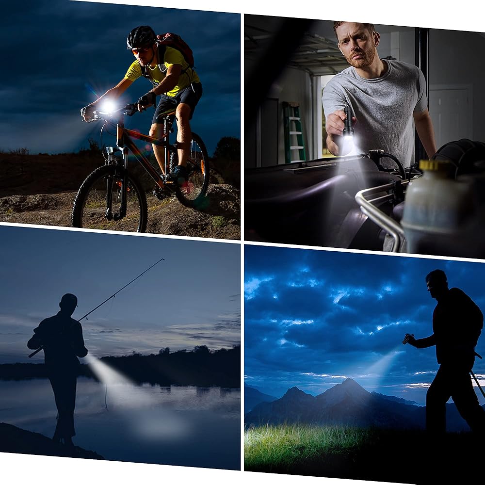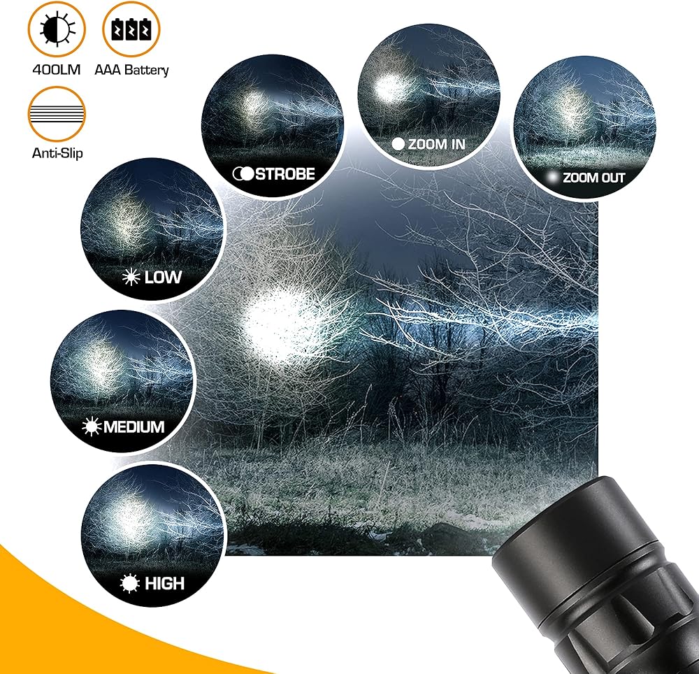 • مصباح يدوي قابل للتكبير مع دائرة الضوء وأضواء الكاشف: يحتوي الحزمة المركزة والقوية لهذا المصباح على مجموعة تصل إلى 525 قدمًا ، شعاعًا واضحًا من الضوء ، بعيد المدى. في وضع الضوء ، تكون منطقة التشعيع كبيرة ، ويمكن رؤية مجال الرؤية على نطاق واسع ، والاستخدام الخارجي لمصباح يدوي أكثر أمانًا ؛ النطاق يصل أيضا إلى 131 قدم.