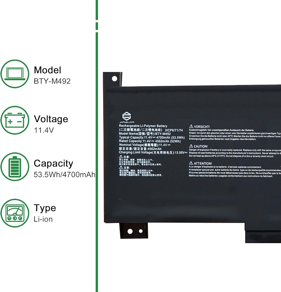 • Model: BTY-M492 // Voltage: 11.4V // Capacity: 53.5Wh 4700mAh // Color: Black // Type: Plug & Play Li-ion Battery.