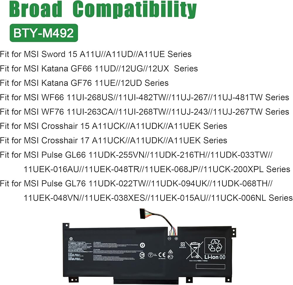 استبدال بطارية الكمبيوتر المحمول Bty-M492 لـ MSI Sword 15 A11u A11ud A11ue Katana GF66 GF76 WF66 WF76 Crosshair 15 17 A11UCK A11UDK A11UEK PULSE GL66 GL76 GL76