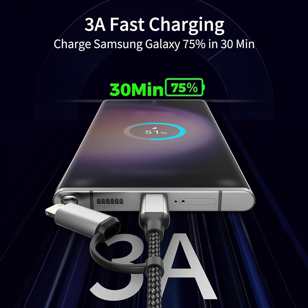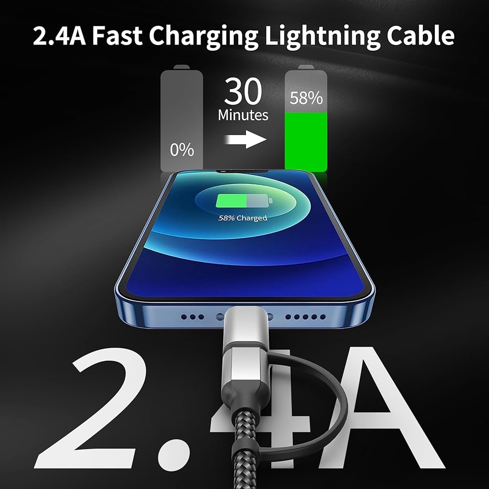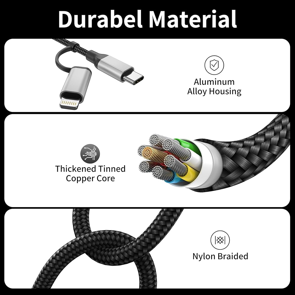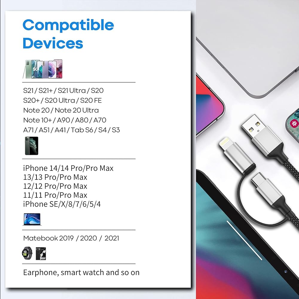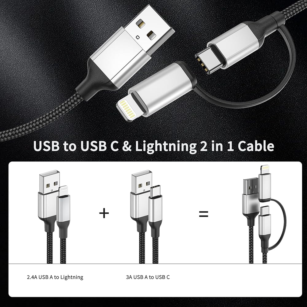 • 2-in-1 شحن Multi Cord لجميع الأجهزة: تبسيط إعداد الشحن الخاص بك مع كابل USB-C متعدد الاستخدامات 2 في 1. فهو يجمع بين منفذين-USB-A إلى Lightning ، USB-A إلى USB-C ، في كابل واحد. توفير حل شامل لاحتياجات الشحن السريع ونقل البيانات.