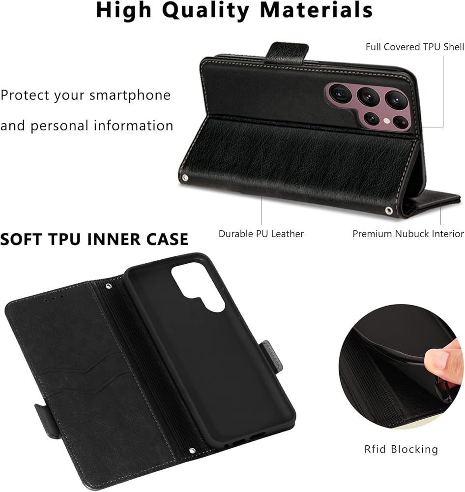 【تقنية التدريع RFID - تحتوي حالة الهاتف لـ Galaxy S23 Ultra على مواد حظر RFID ، ويمكنها حماية بطاقات الائتمان والمعرف الخاصة بك من عمليات الفحص غير المصرح بها والسرقة. هذا الغطاء المغناطيسي يحافظ على شاشتك وبطاقاتك وبطاقاتك النقدية بشكل آمن.