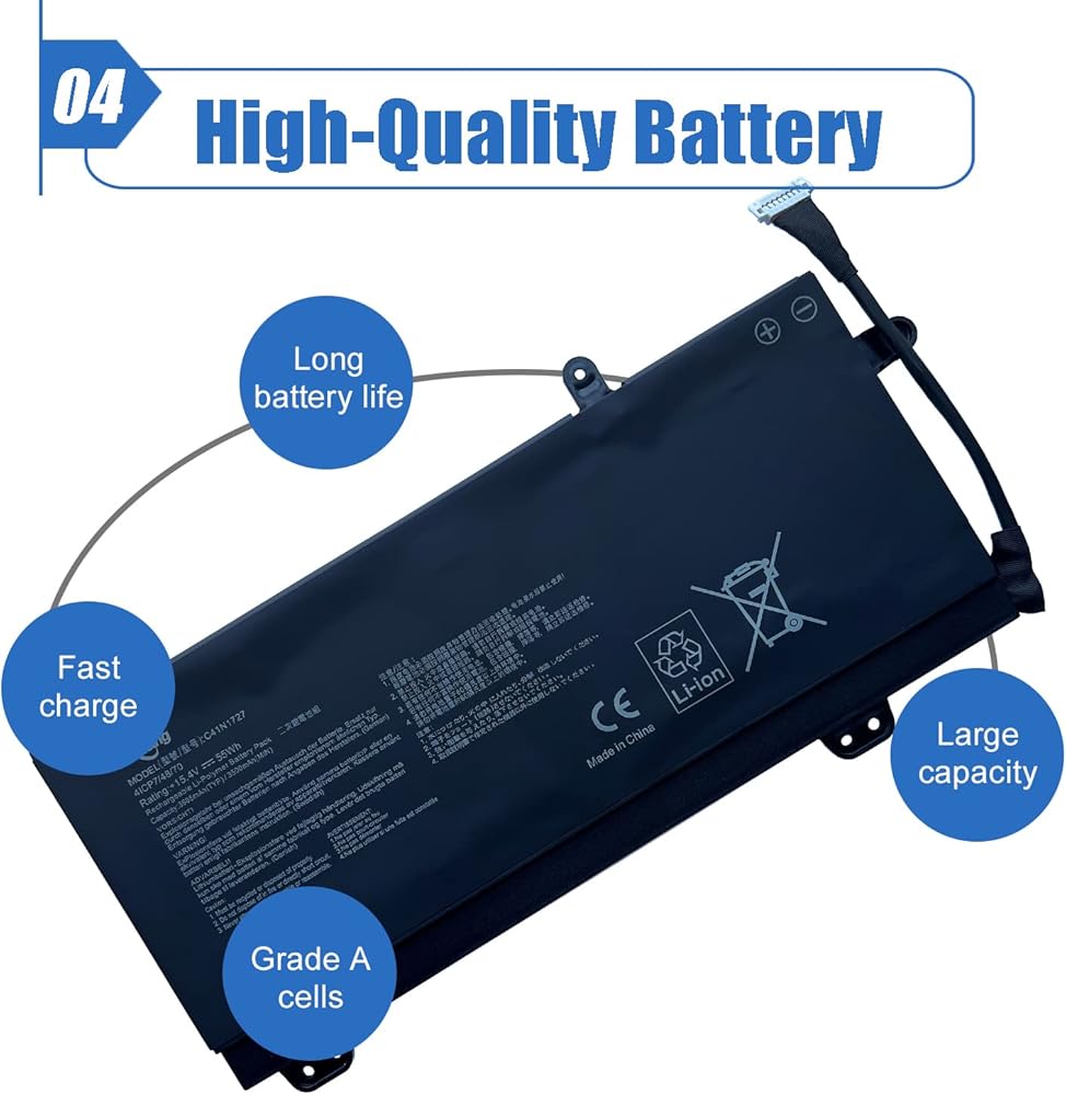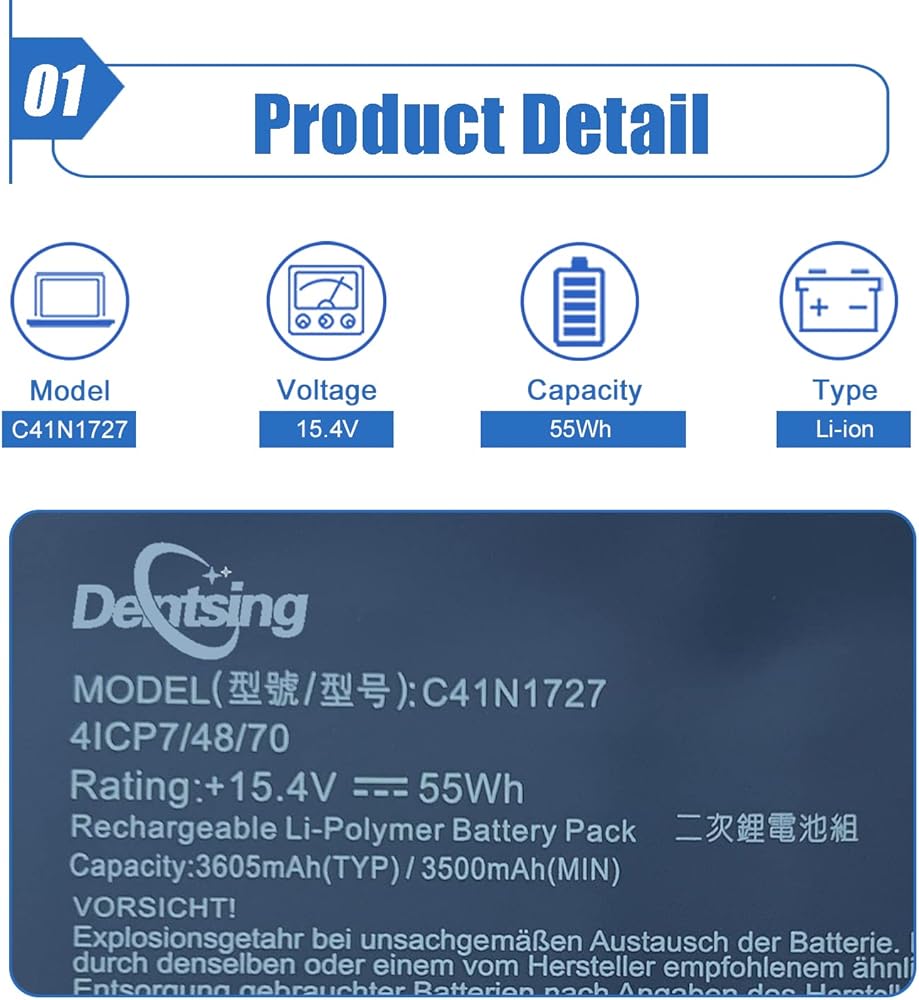 【التفاصيل الأساسية】 نموذج العنصر: C41N1727 ؛ نوع البطارية: لي أيون ؛ الجهد: 15.4 فولت ؛ السعة: 55WH/3605MAH ؛ لون البطارية: أسود