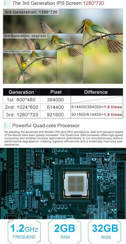 • 【راديو سيارة عالي الأداء】 التخصيص نظام Android مع Cortex Arm Cortex 4-Core 1.2 جيجا هرتز ، وذاكرة RAM 2GB+32 جيجابايت ، تقدم لك تجربة أسرع وأكثر سلاسة. مع شاشة اللمس في Generation Fouth ، وحجم 9 بوصة ودقة عرض 1280 × 800 ، اللون الأكثر ثراءً وعرضًا أكثر وضوحًا (ملاحظة: دقة عرض الشاشة 1280 × 800 ، إخراج الفيديو إلى دقة الشاشة الخارجية IS1024x600 ، مثل عرض المقعد الخلفي)