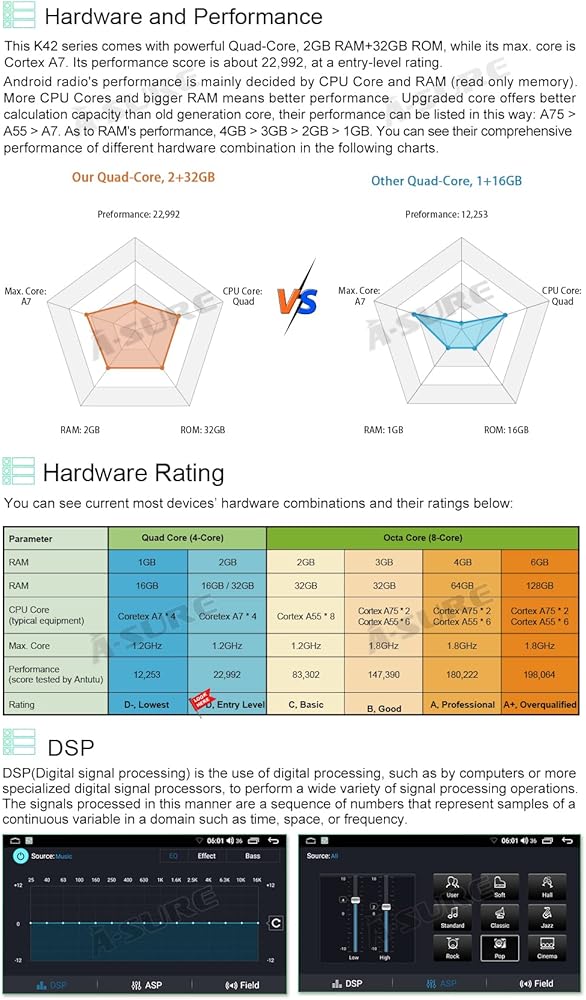 • 【DSP Car Steroo】 مدمج في DSP & eq.output 4*45W (45W لكل قناة) يوفر جودة صوت رائعة. يمكن لمعالجة الصوت المحيطي DSP تخصيص أفضل تأثير لتشغيل الصوت لمقاعد مختلفة وفقًا لاحتياجاتك ، استمتع بالموسيقى أثناء القيادة
