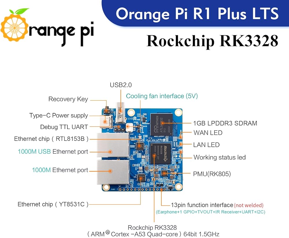 • Orange Pi R1 Plus LTS (soft routing) adopts Rockchip RK3328 64-bit 1.5GHZ high-performance quad-core Cortex-A53 processor, 1GB LPDDR3 running memory, integrated dual Gigabit network interface, USB2.0 interface, TF card slot slot, Type-C power supply, power management, 16MB SPI FLASH onboard storage, debugging serial port, etc.
